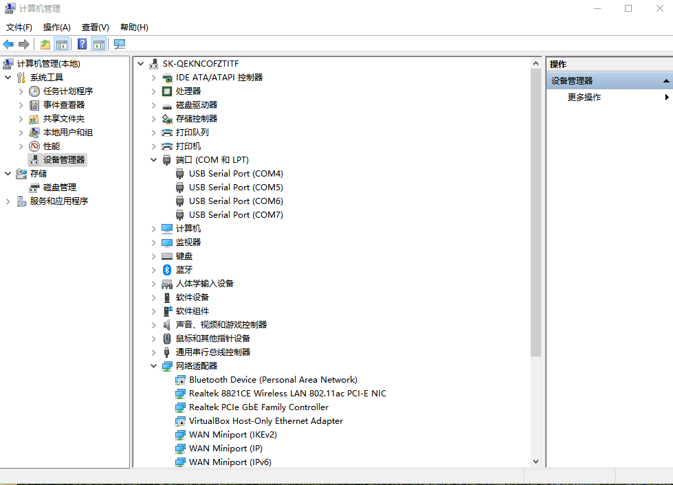 電腦鼠標(biāo)點(diǎn)擊計(jì)算機(jī)管理,右擊,點(diǎn)開(kāi)設(shè)備管理器,點(diǎn)擊端口,查看接WH-L101-L-H20和USR-LG210的USB-RS232串口線COM口號(hào)。