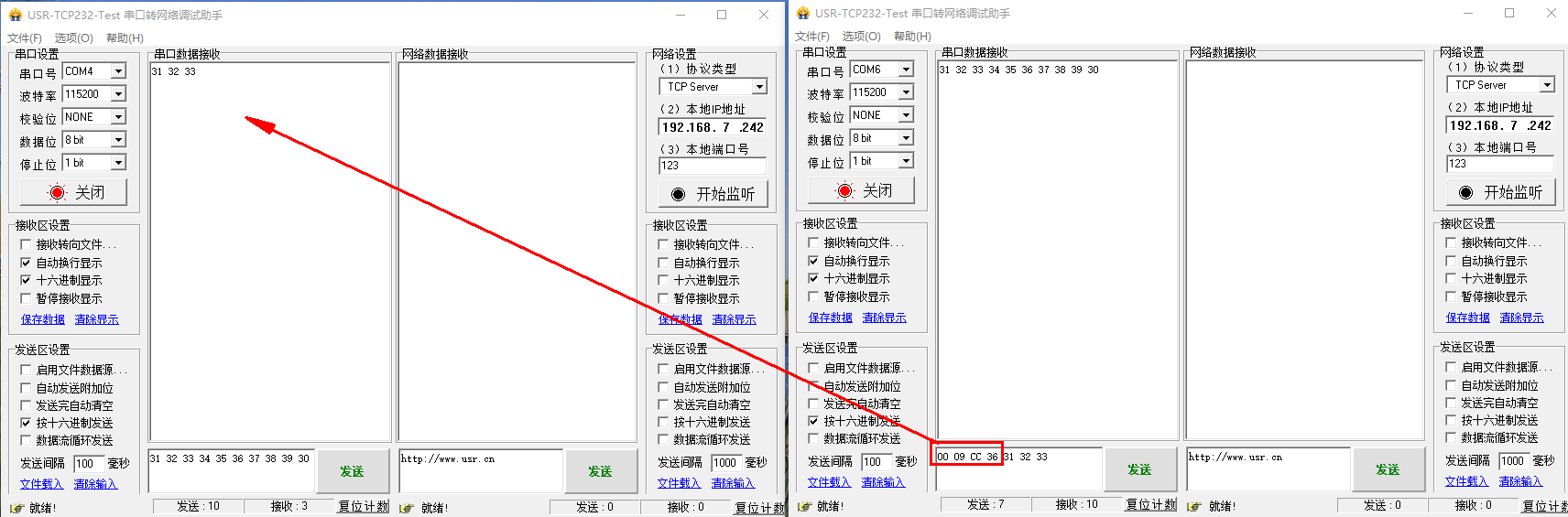 電腦打開(kāi)2個(gè)USR-TCP232-TEST串口軟件,打開(kāi)對(duì)應(yīng)WH-L101-L-H20和USR-LG210的USB-RS232串口線COM口號(hào),USR-LG210串口發(fā)送十六進(jìn)制數(shù)據(jù),數(shù)據(jù)前面帶節(jié)點(diǎn)ID,WH-L101-L-H20串口接收十六進(jìn)制數(shù)據(jù)。這樣USR-LG210可以指定向WH-L101-L-H20發(fā)送數(shù)據(jù)。