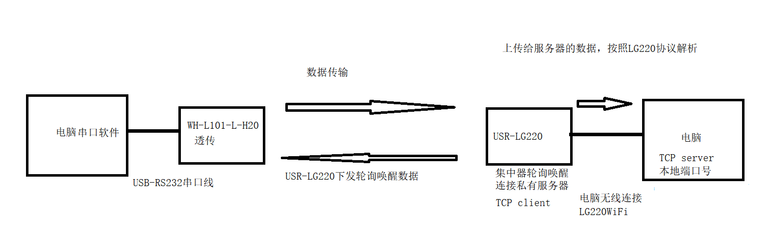 WH-L101-L-H20串口可以直接發(fā)送數(shù)據,USR-LG220 TCP client連接的TCP server服務器接收USR-LG220協(xié)議的數(shù)據。
