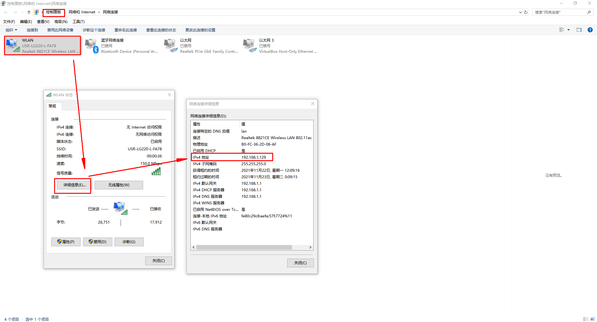 查看無線網卡狀態(tài),IPv4的IP地址。