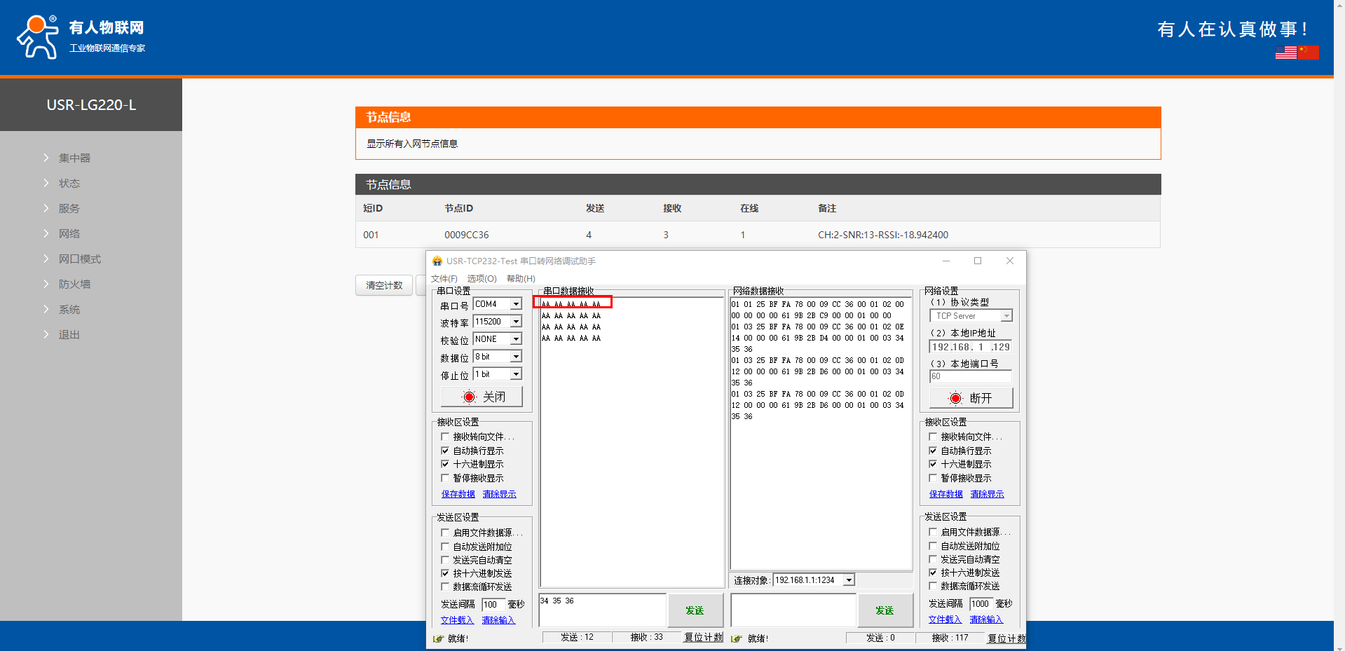登錄USR-LG220內置網頁,可以查看節(jié)點信息,確認節(jié)點是否入網到USR-LG220