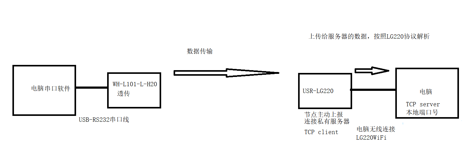 WH-L101-L-H20串口可以直接發(fā)送數(shù)據(jù),USR-LG220 TCP client連接的TCP server服務(wù)器接收USR-LG220協(xié)議的數(shù)據(jù)。