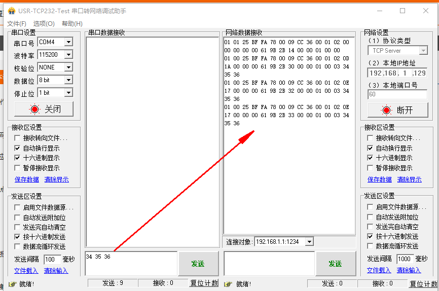 電腦打開1個(gè)USR-TCP232-TEST串口軟件,勾選十六進(jìn)制顯示和按十六進(jìn)制發(fā)送。