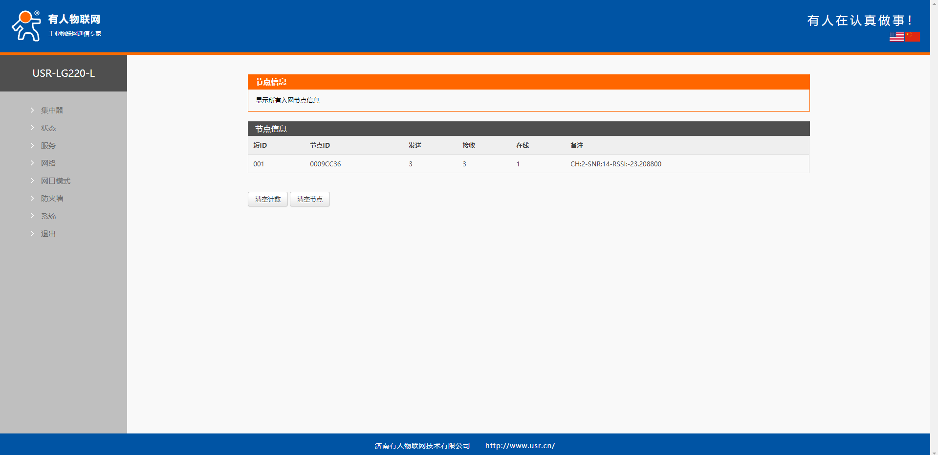登錄USR-LG220內(nèi)置網(wǎng)頁,可以查看節(jié)點(diǎn)信息,確認(rèn)節(jié)點(diǎn)是否入網(wǎng)到USR-LG220