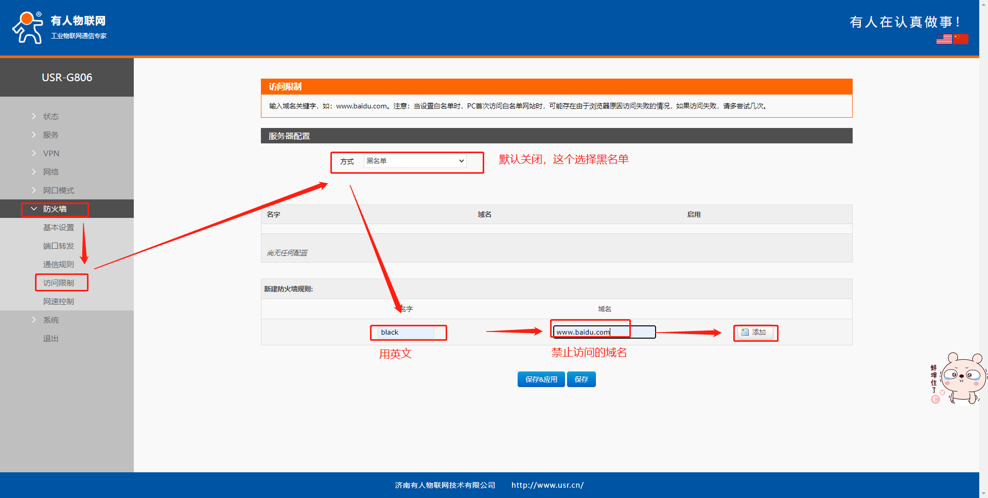 功能解釋:連接路由器的設(shè)備無法訪問黑名單的域名,其它域名地址可以正常訪問