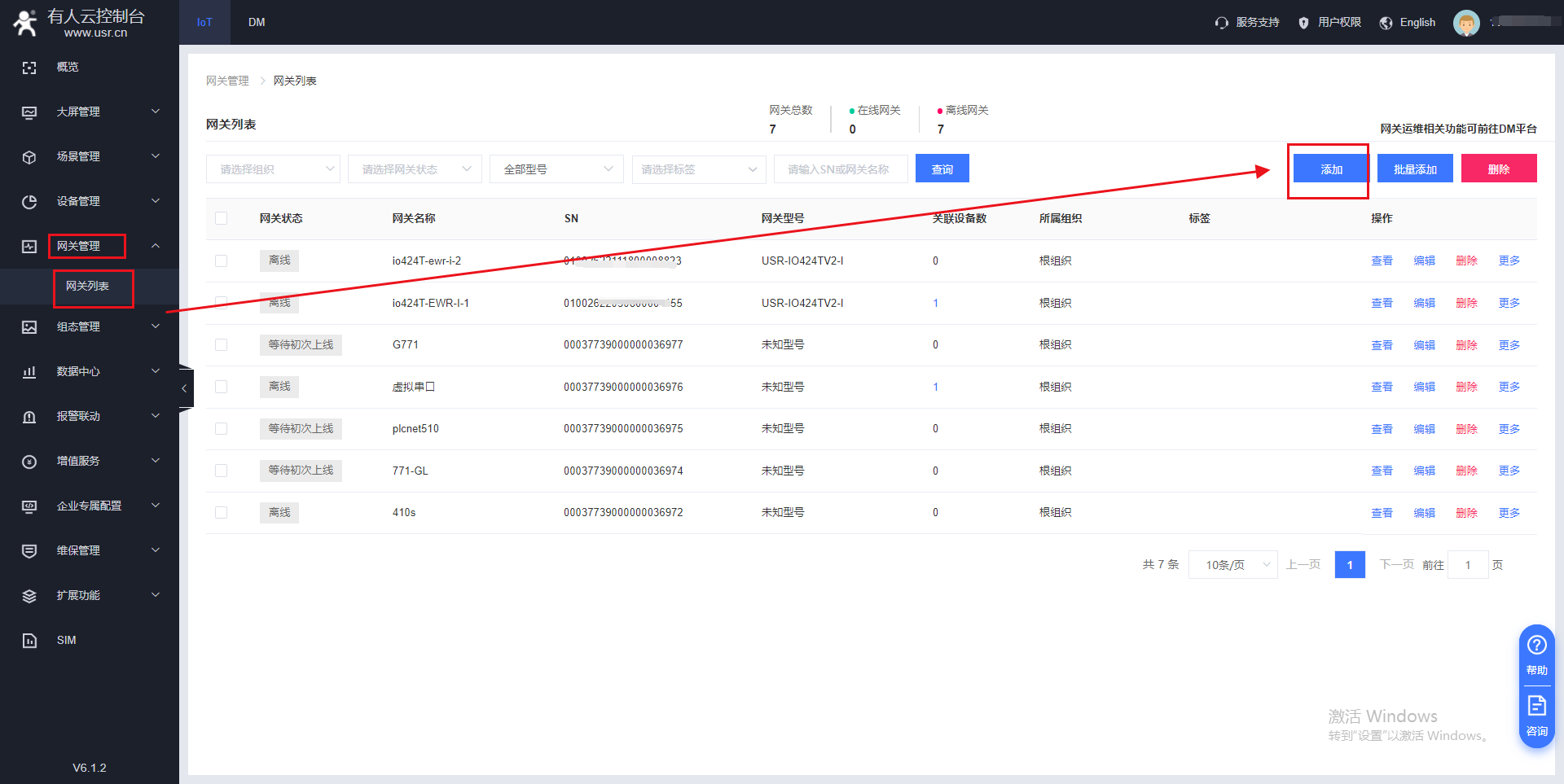 (1)云平臺(tái)添加網(wǎng)關(guān),在網(wǎng)關(guān)管理---網(wǎng)關(guān)列表--添加,點(diǎn)擊SN不支持,系統(tǒng)自動(dòng)生成,不需要客戶自己設(shè)置,通訊密碼可以自定義8位密碼.(建議使用系統(tǒng)自動(dòng)生成的通訊密碼)