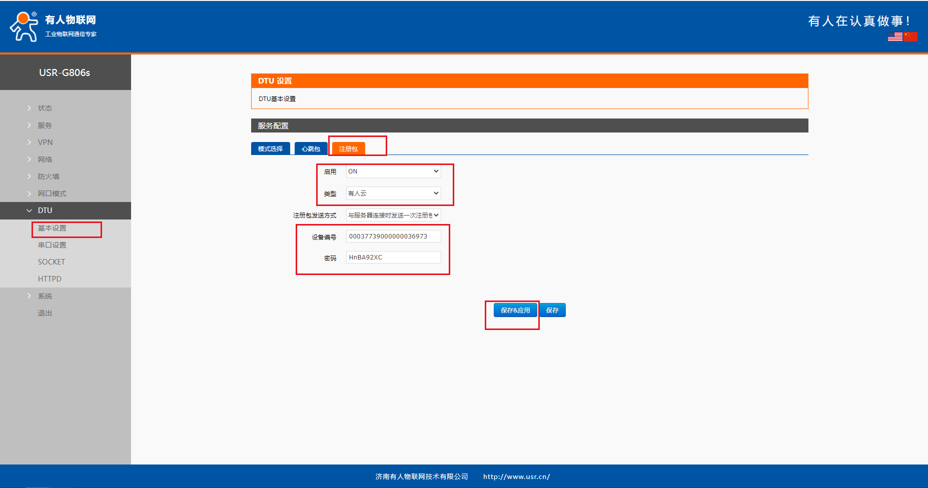 在DTU---基本設(shè)置---心注冊包,注冊包類型選擇有人云,設(shè)備編號(hào)和密碼填寫云端自動(dòng)分配的。