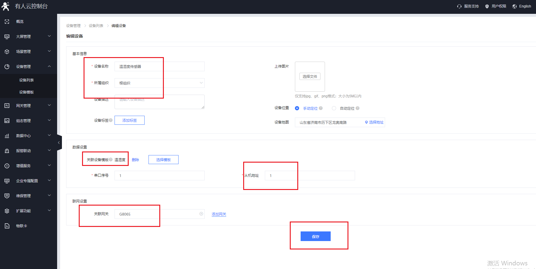7、在設(shè)備管理--設(shè)備列表的界面添加一個(gè)設(shè)備,把設(shè)備模板和網(wǎng)關(guān)進(jìn)行關(guān)聯(lián),并配置串口終端設(shè)備的從機(jī)地址。(測試從機(jī)地址設(shè)置為1)