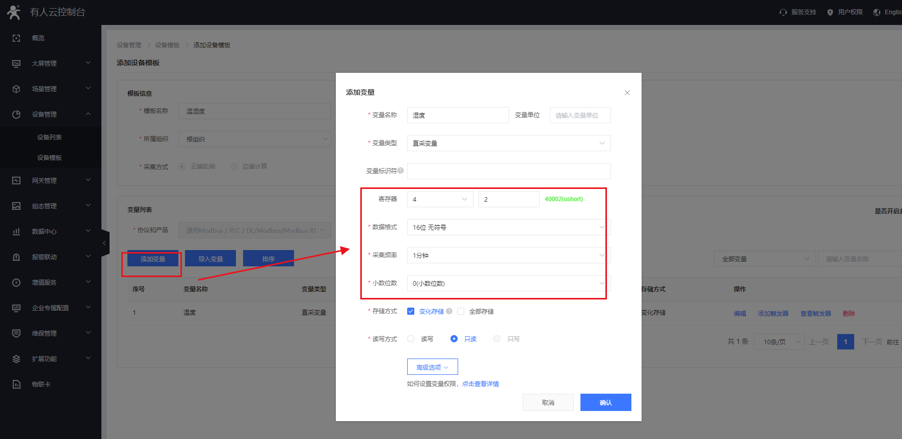 2)在設(shè)備管理---設(shè)備模板界面添加需要采集的從機(jī)變量點(diǎn)。寄存器信息需要與串口設(shè)備進(jìn)行匹配。(測試用modbus savle 軟件模擬modbus rtu485設(shè)備,采集變量40001、40002)