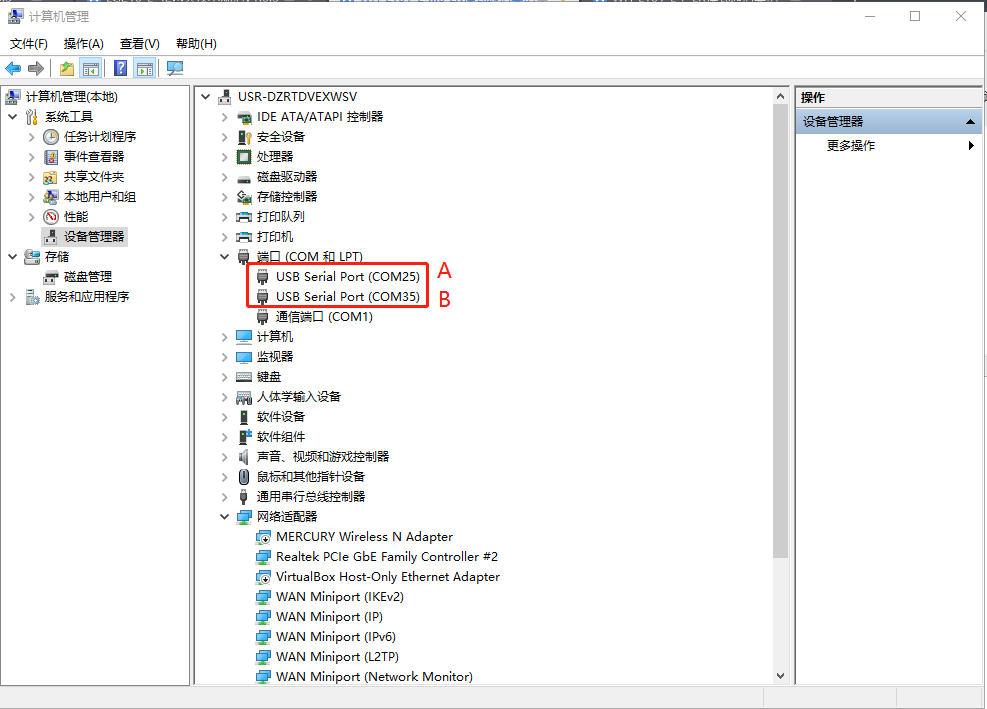 電腦鼠標(biāo)點(diǎn)擊計(jì)算機(jī)管理,右擊,點(diǎn)開設(shè)備管理器,點(diǎn)擊端口,查看接2個(gè)WH-L101-L-H20的USB-RS232串口線COM口號(hào)。