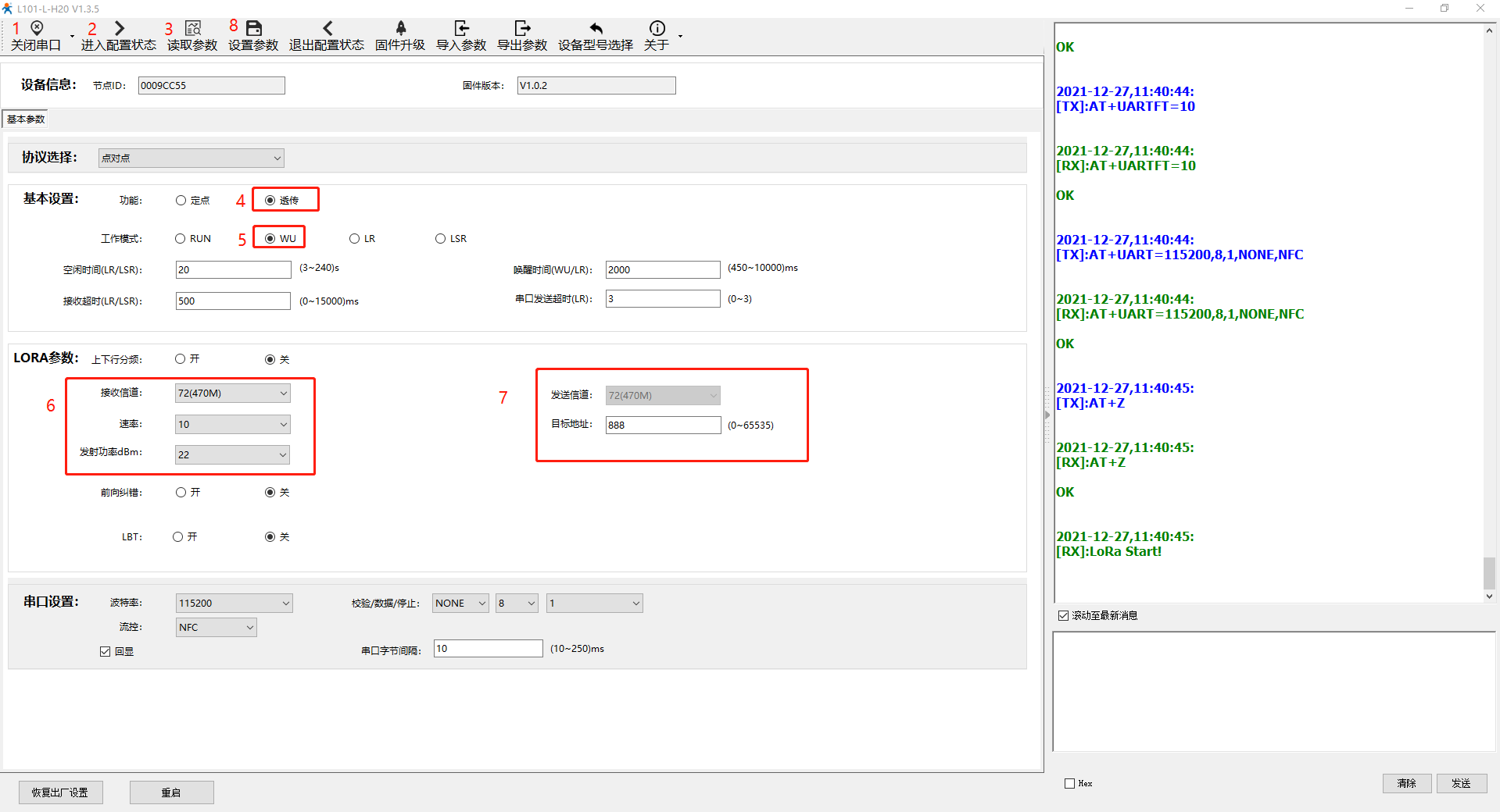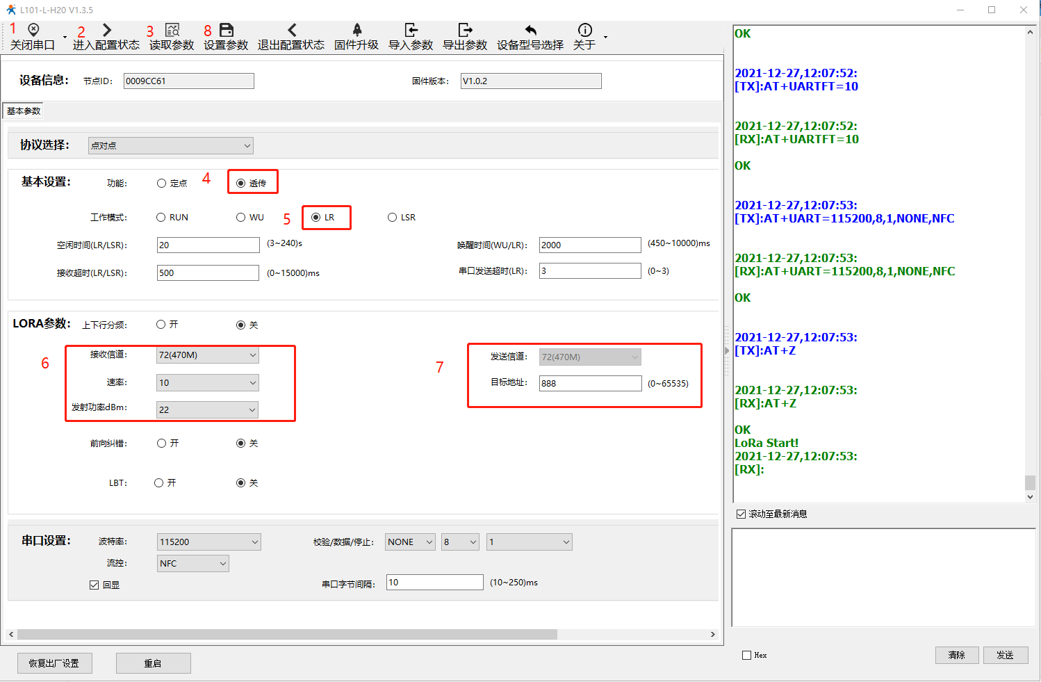 6、點(diǎn)擊“打開串口”,點(diǎn)擊“進(jìn)入配置狀態(tài)”,返回+ok后點(diǎn)擊“讀取參數(shù)”。然后設(shè)置透?jìng)鞴δ埽?/span>LR模式,信道72,速率10,目標(biāo)地址888。最后點(diǎn)擊“設(shè)置參數(shù)”。
