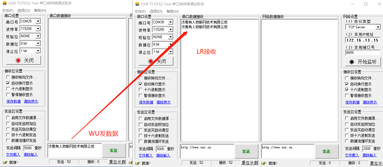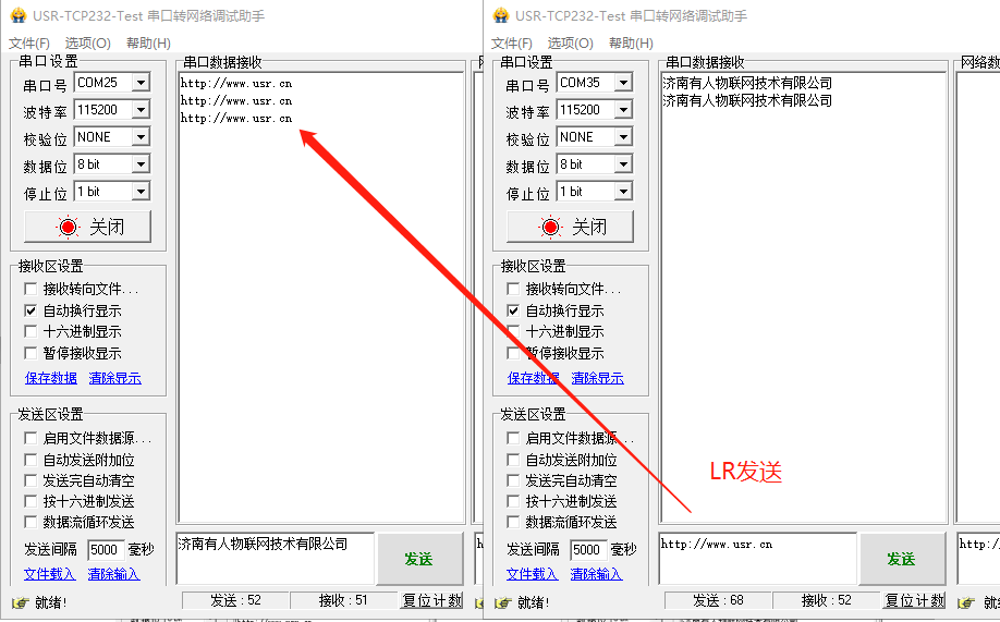 啟動(dòng)兩個(gè)USR-TCP232-Test分別連接LoRa數(shù)傳終端A(com25)、B(com35),使用WU設(shè)備發(fā)送數(shù)據(jù)LR設(shè)備可接收數(shù)據(jù),通信效果如下圖所示: