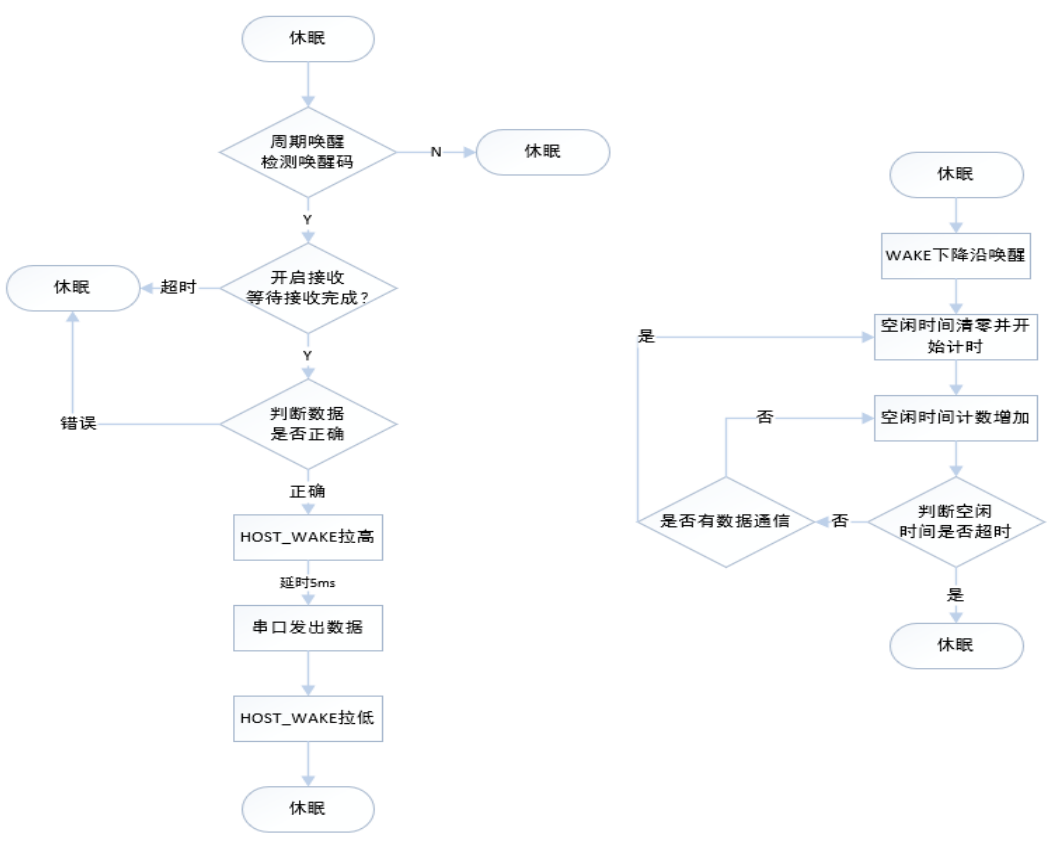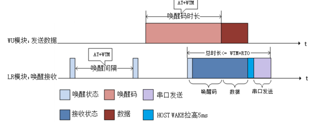 LR 低功耗接收模式,上電后如果無線和串口持續(xù)一定時(shí)間無數(shù)據(jù)通信則模塊進(jìn)入休眠,休眠后模塊 定期(AT+WTM 設(shè)置喚醒間隔)喚醒來檢測(cè)喚醒碼,如果檢測(cè)到喚醒碼模塊立即進(jìn)入接收狀態(tài),等待接收 完成,接收完成后 HOST_WAKE 引腳會(huì)在串口發(fā)送數(shù)據(jù)前拉高 5ms,數(shù)據(jù)發(fā)送完成拉低(客戶可使用 HOST_WAKE 引腳喚醒自己的 MCU),若只檢測(cè)到喚醒碼未接收到數(shù)據(jù),則等待超時(shí)后進(jìn)入休眠狀態(tài)。 休眠后也可以通過 WAKE 引腳下降沿中斷來喚醒模塊,喚醒后的模塊恢復(fù)運(yùn)行模式,當(dāng)空閑時(shí)間大于 設(shè)定時(shí)間時(shí)模塊再次進(jìn)入休眠狀態(tài)。