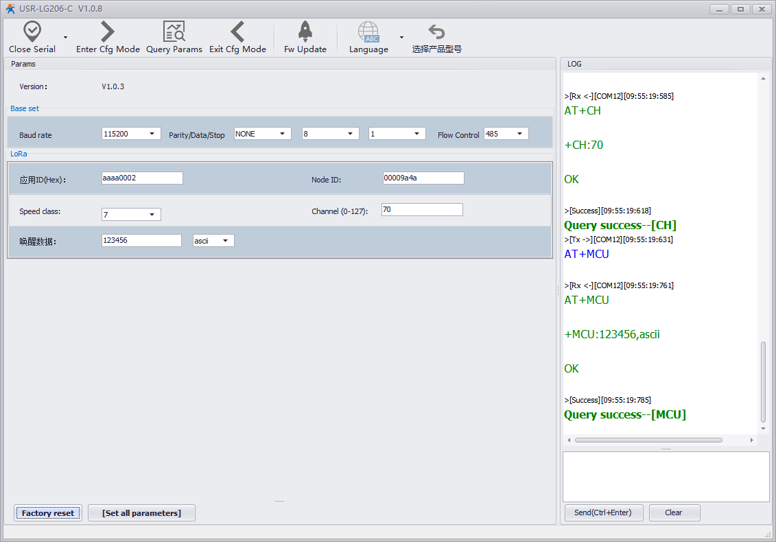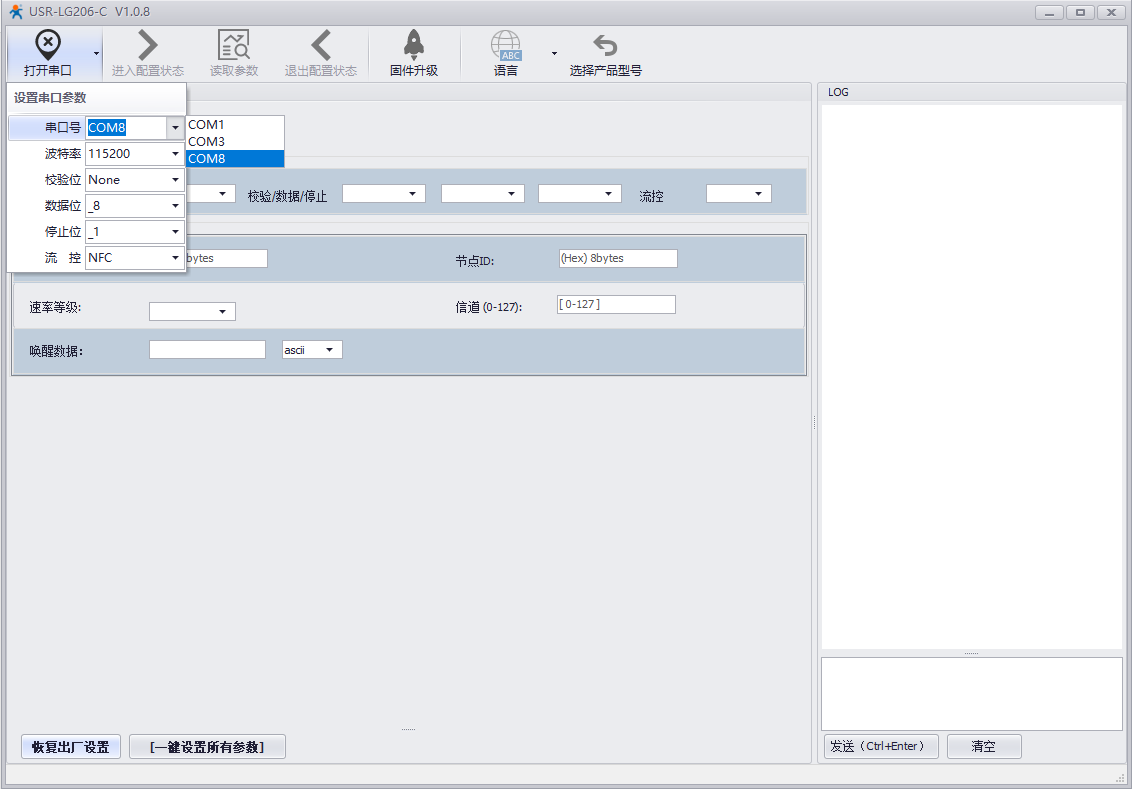 這里以有人LoRa終端USR-LG206-L-C為例。使用串口線連接LoRa終端的RS232接口與電腦,打開USR_LoRa軟件(http://m.lifj.com.cn/Down/USR_LoRa_SET-V1.0.8.rar),選擇LG206-C。