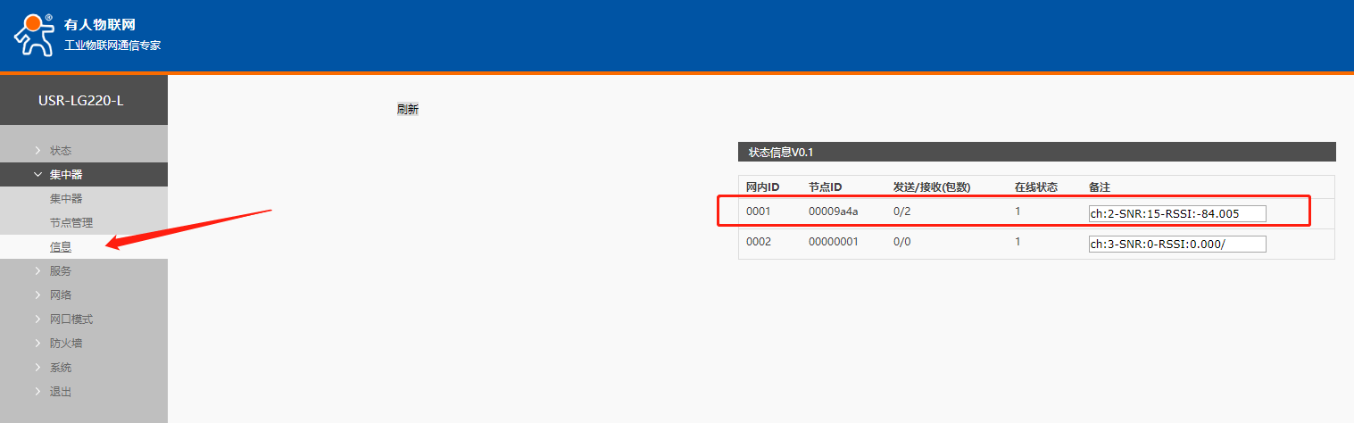(6)點(diǎn)擊系統(tǒng)—重啟,執(zhí)行重啟。重啟完畢登陸集中器在集中器—信息 可參看加入的節(jié)點(diǎn)信息,串口助手會(huì)顯示連接對(duì)象ip與端口號(hào)。