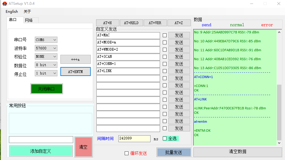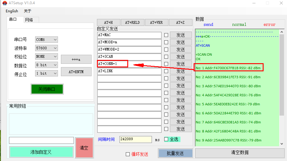 (3)根據(jù)掃描結(jié)果進行連接,發(fā)送AT+CONN=1