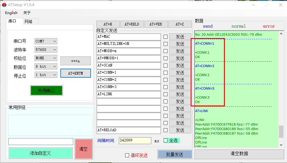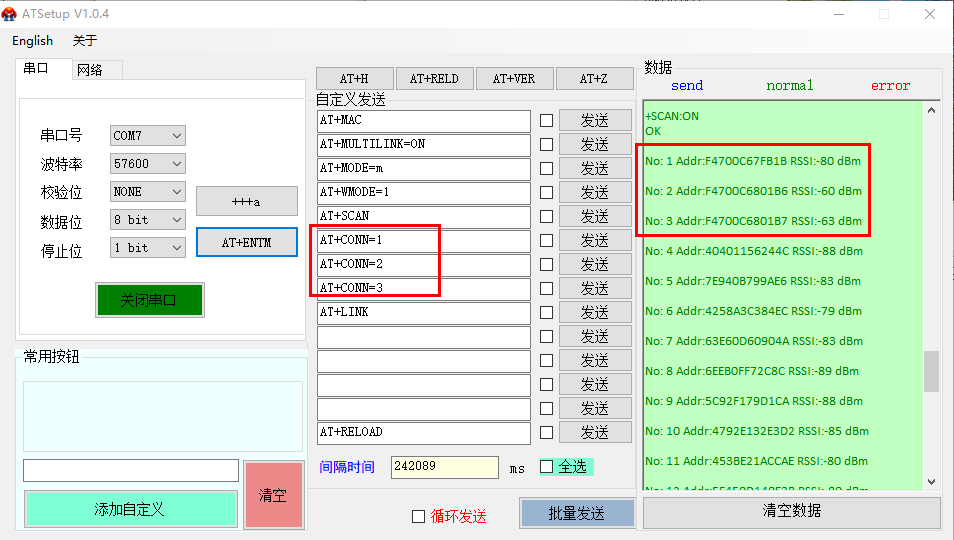 (3)根據(jù)掃描結(jié)果進(jìn)行連接,依次發(fā)送AT+CONN=1、AT+CONN=2、AT+CONN=3,連接3個從機(jī)