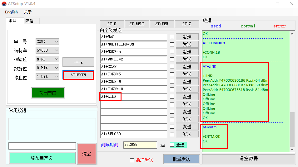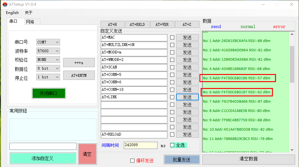 (3)根據(jù)掃描結果進行連接,依次發(fā)送AT+CONN=5、AT+CONN=6、AT+CONN=18,連接3個從機