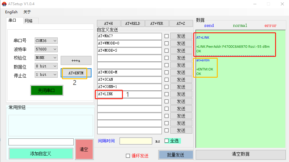 關(guān)閉AT指令設置軟件的串口后打開串口測試軟件,可以進行數(shù)據(jù)透傳通信測試。