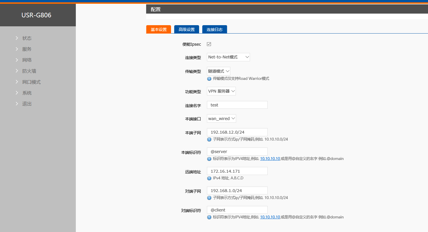 邏輯與G806的設(shè)置完全一致,協(xié)商方法、隧道類型、IKE及ESP加密方式、認證方式、預(yù)共享密鑰全部與G806VPN服務(wù)器的參數(shù)一致,本端子網(wǎng)及標識符、對端子網(wǎng)及標識符與G806VPN服務(wù)器的設(shè)置相反