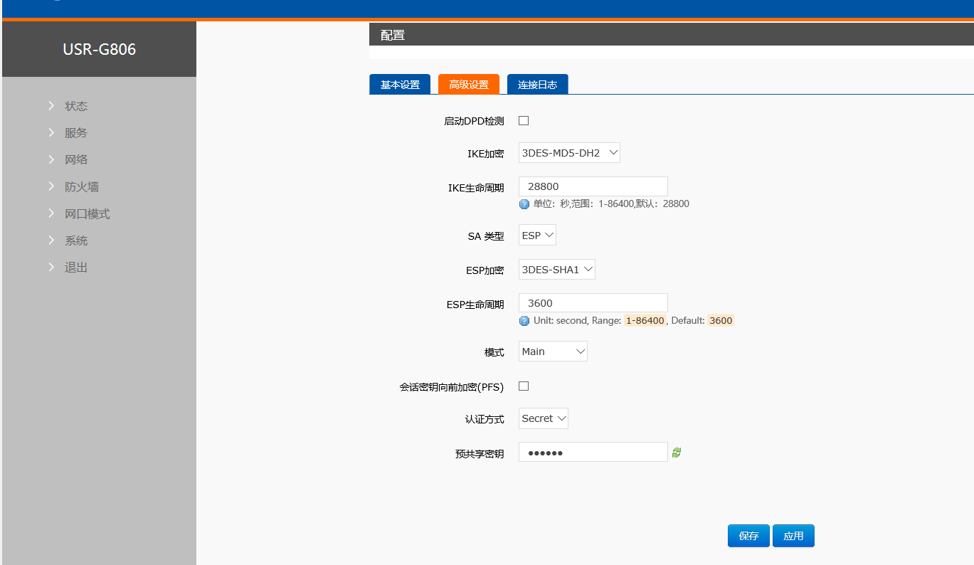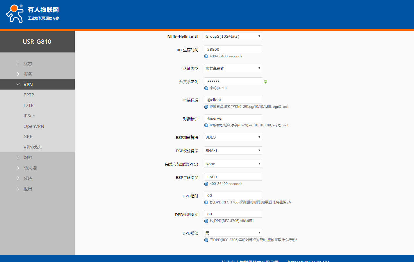 IKE 生命周期:設(shè)置 IKE 的生命周期,單位為秒,默認:28800