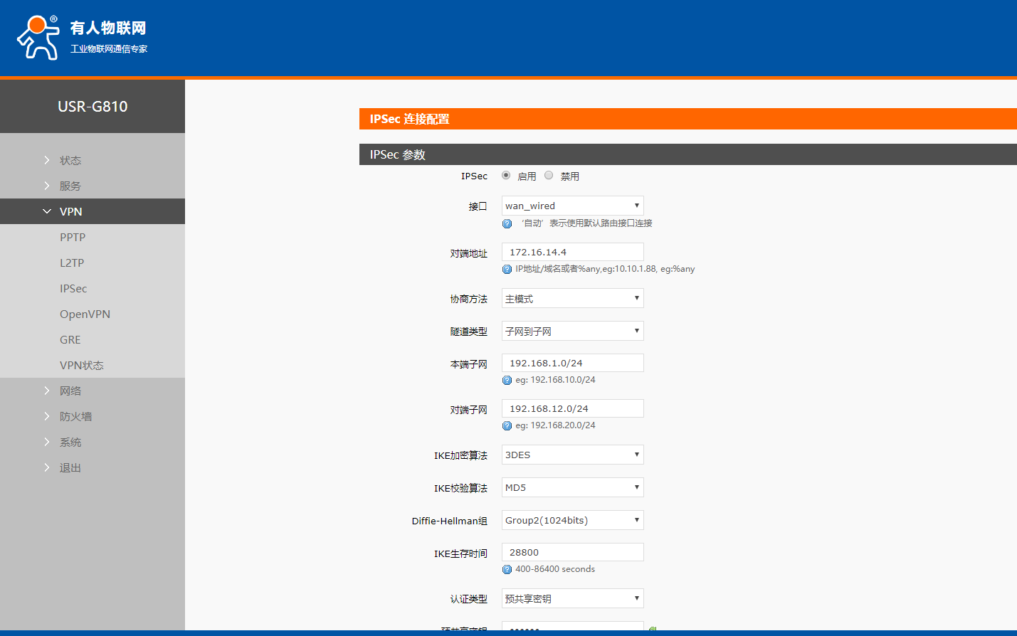 USR-G810與USR-G806搭建IPSEC子網(wǎng)對子網(wǎng)模式通信測試