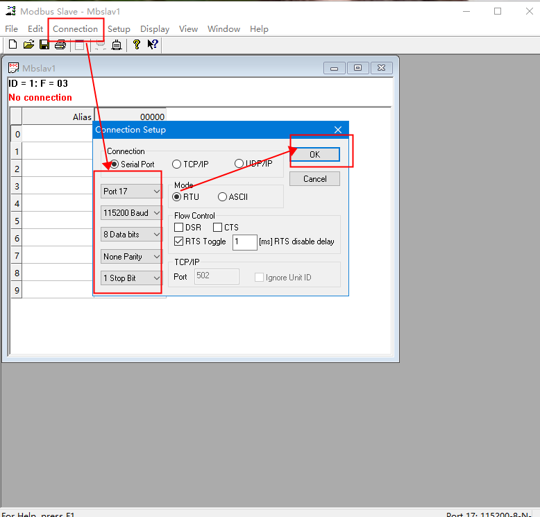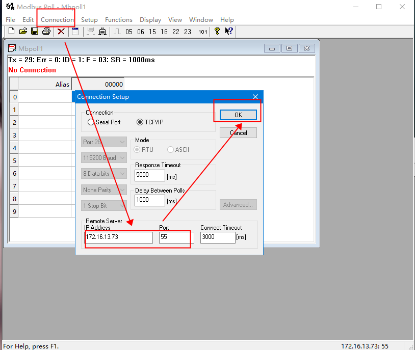 MODBUS POLL軟件設(shè)置MODBUS TCP/IP。IP地址填DR302的IP地址,Server Port填DR302的端口號55。注意MODBUS POLL軟件的3個時(shí)間參數(shù),依次是