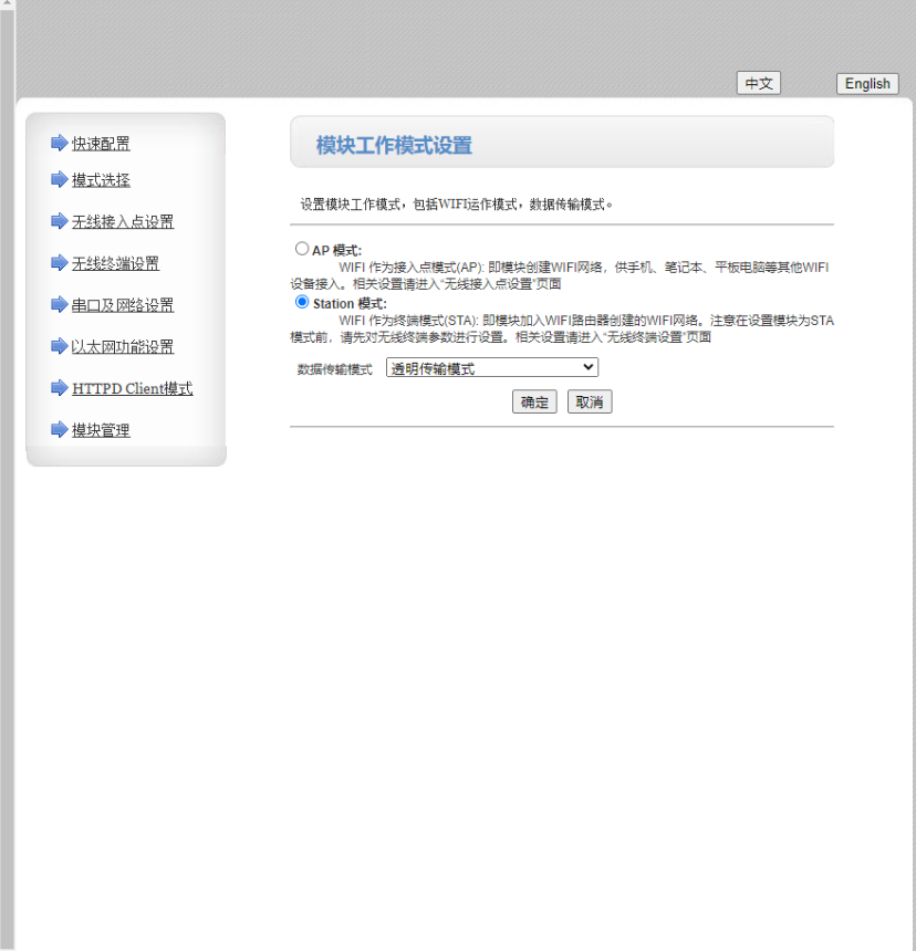 1、登錄之后,在模式選擇中,將USR-W610的工作模式從默認(rèn)AP模式改為STA模式,點(diǎn)擊確定,會跳出重啟提示,建議不要立刻重啟,需要所有網(wǎng)頁參數(shù)設(shè)置完畢之后,最后再重啟USR-W610。