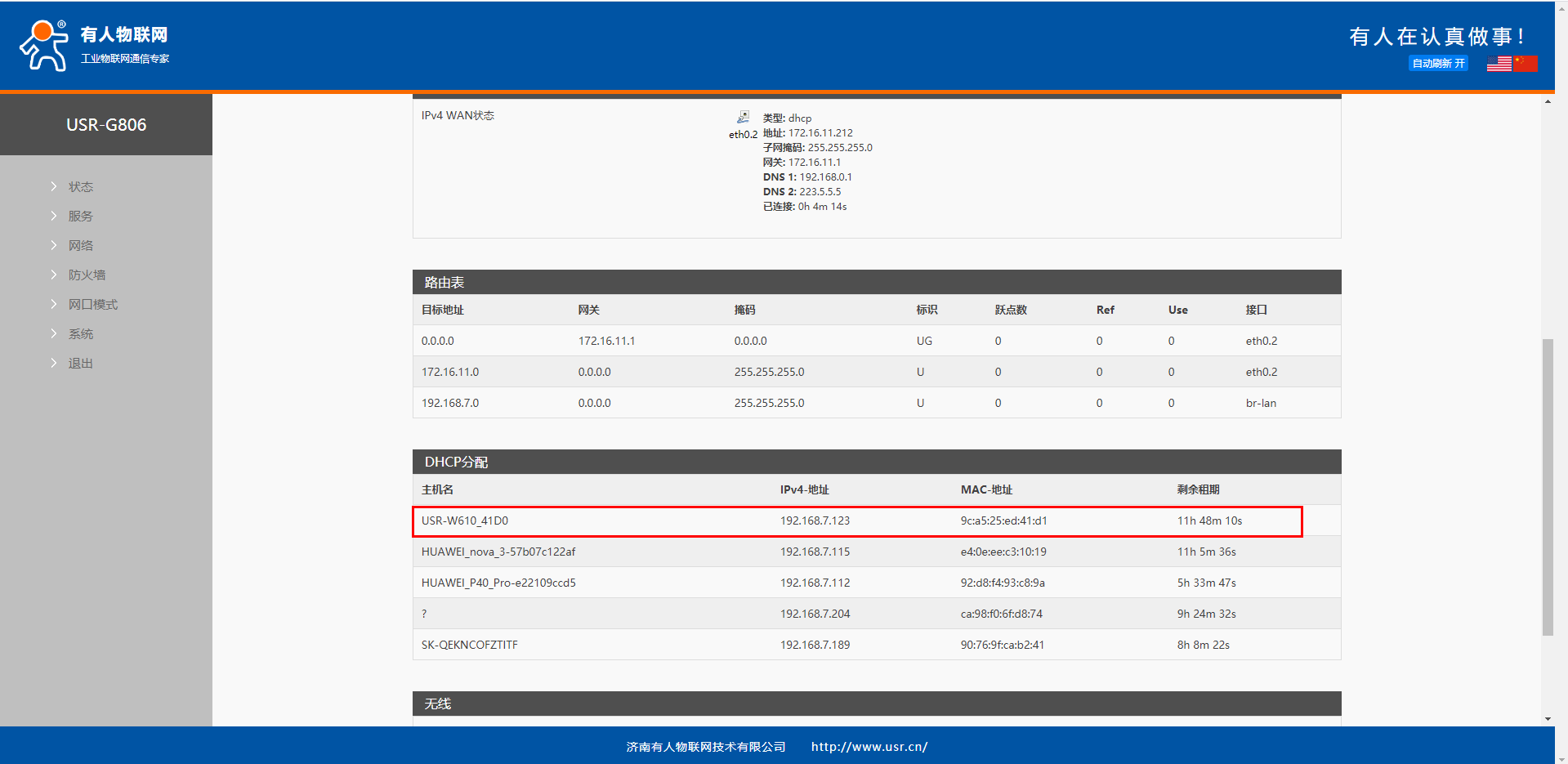 2、也可以登錄路由器內(nèi)置網(wǎng)頁DHCP列表查看路由器給USR-W610分配的IP。