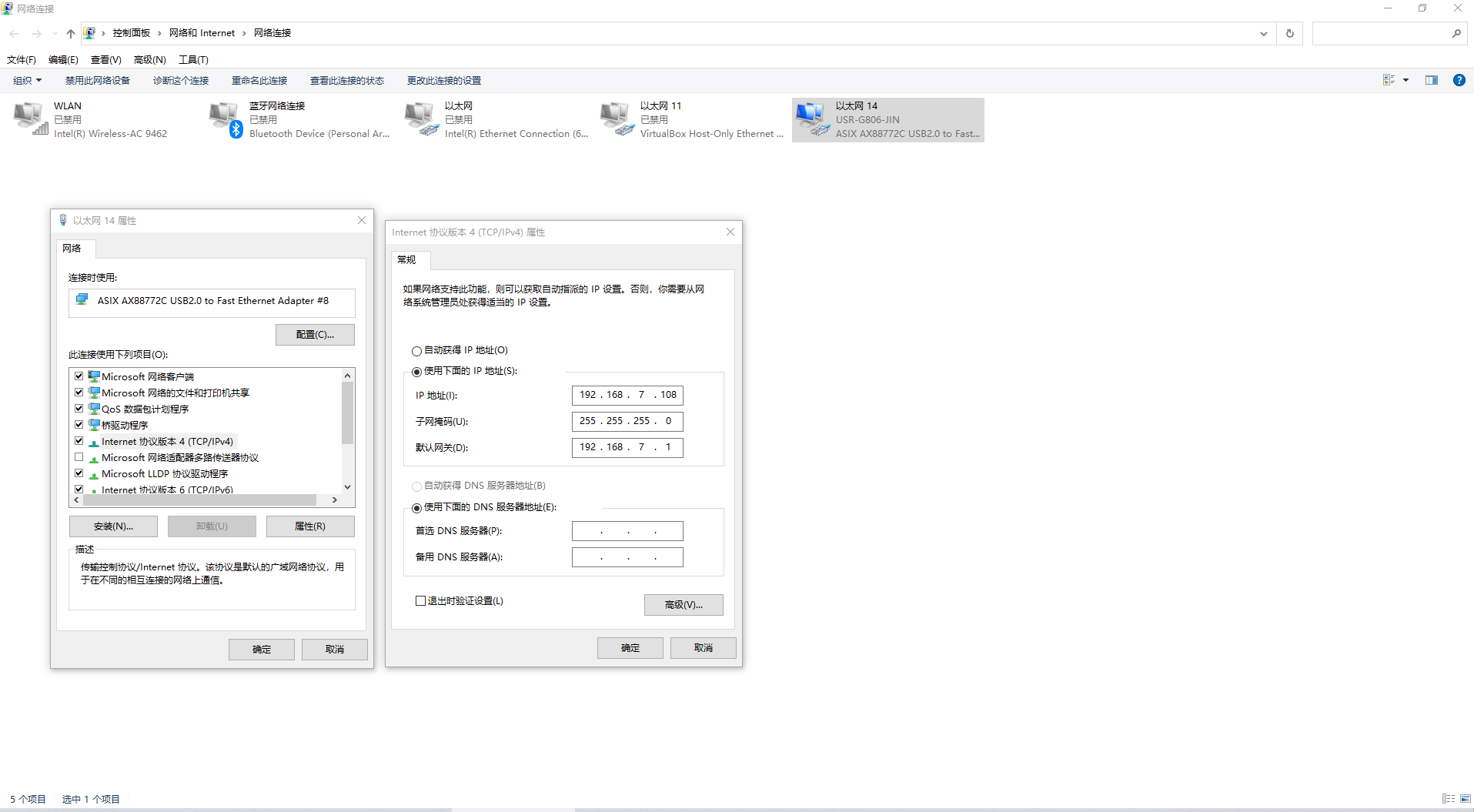 2、第二臺電腦用網(wǎng)線接路由器網(wǎng)口,本地連接設(shè)置DHCP獲取IP,動態(tài)獲取的IP是192.168.7.108。將本地連接DHCP改為靜態(tài)IP,IP:192.168.7.108,子網(wǎng)掩碼:255.255.255.0,網(wǎng)關(guān):192.168.7.1。第二臺電腦關(guān)閉防火墻,禁用其他網(wǎng)卡。