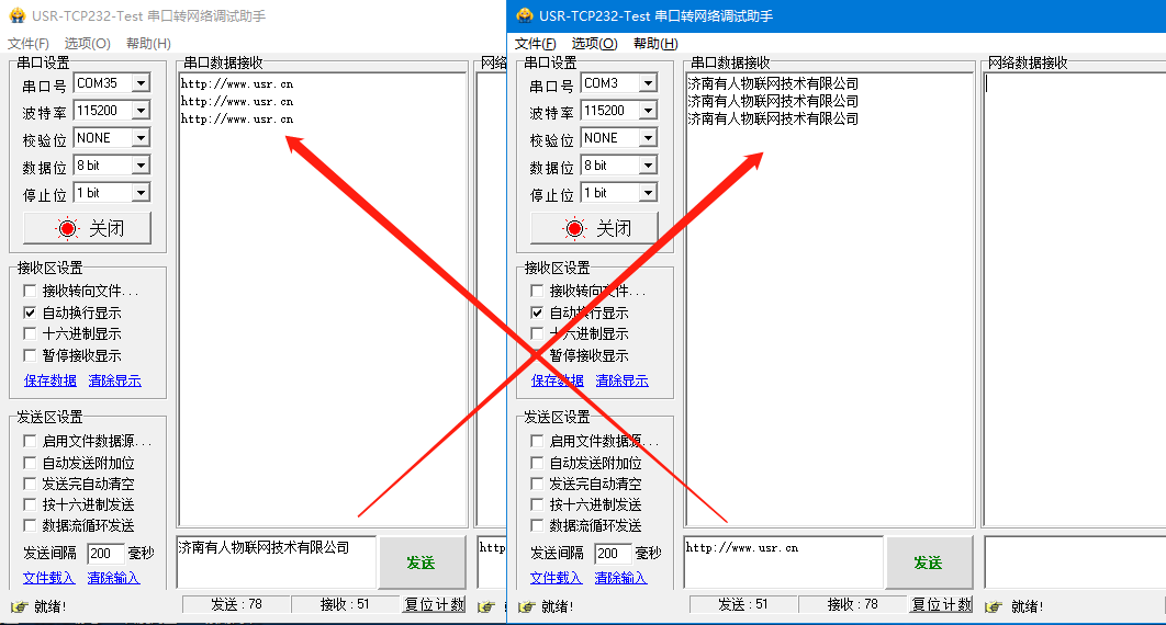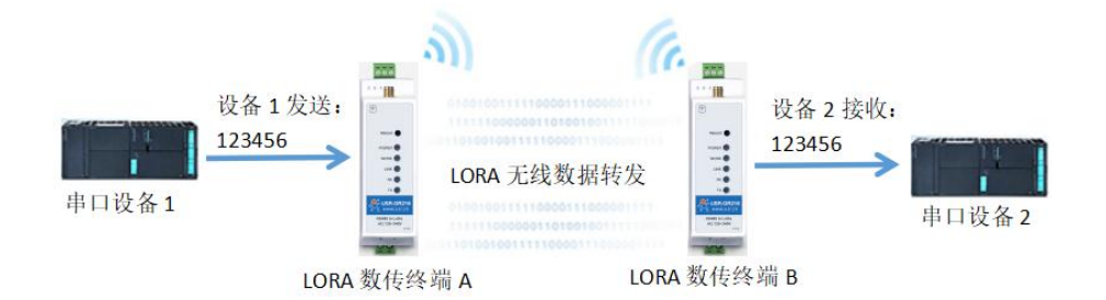 (3)啟動兩個USR-TCP232-Test(模擬串口設(shè)備1,2)分別連接LoRa數(shù)傳終端A、B的串口,使用串口設(shè)備1發(fā)送數(shù)據(jù)串口設(shè)備2可接收數(shù)據(jù)(反之亦然),通信效果如下圖所示: