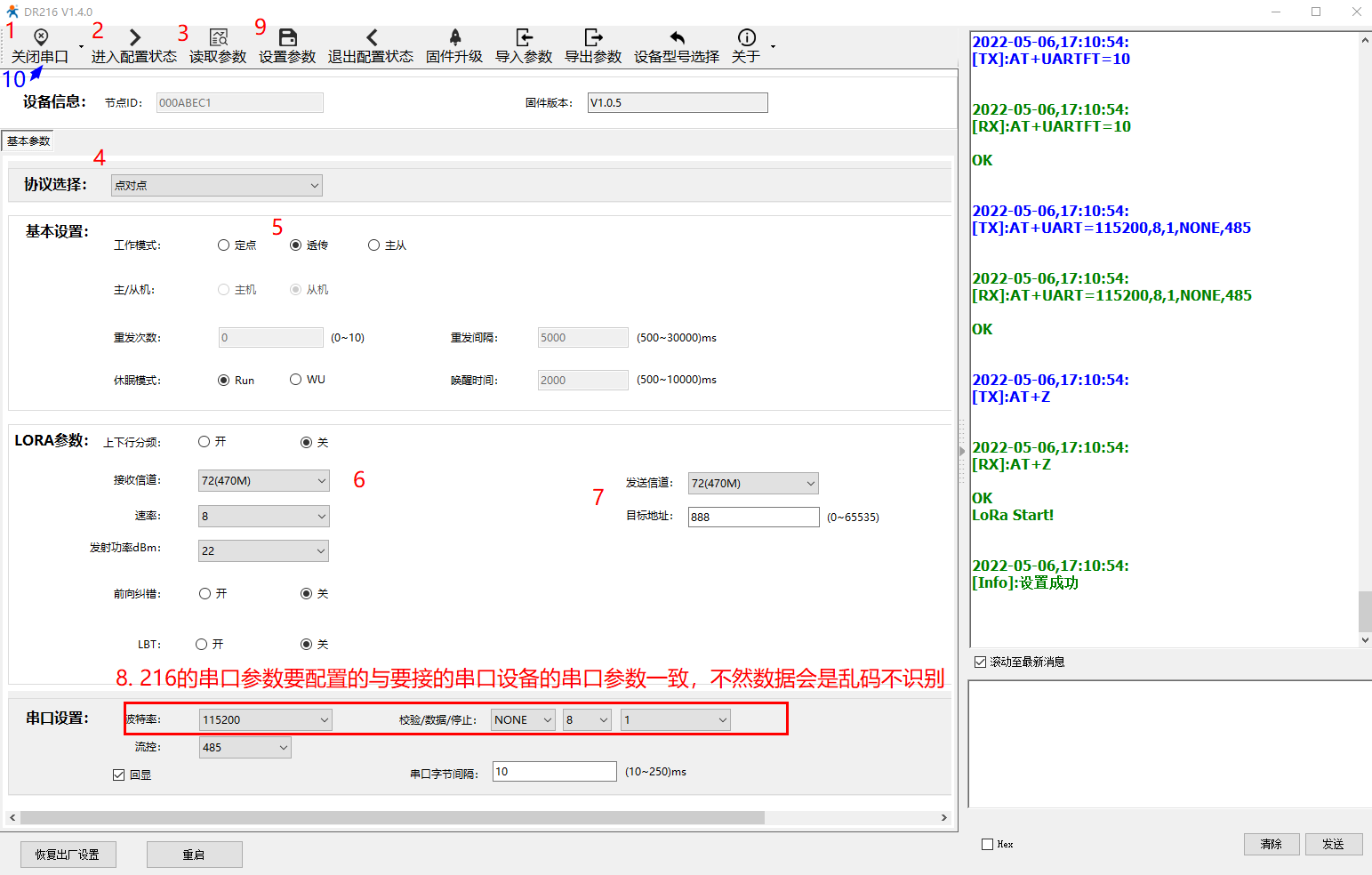 點擊打開串口(選擇A、B對應(yīng)的串口號,DR216默認串口參數(shù):115200,None,8,1,NFC)、進入配置狀態(tài)、讀取參數(shù)、配置速率等級8,信道72,目標地址888, 串口設(shè)置中的參數(shù)配置為您實際要連接的串口設(shè)備的串口參數(shù), 點擊設(shè)置所有參數(shù),關(guān)閉串口。
