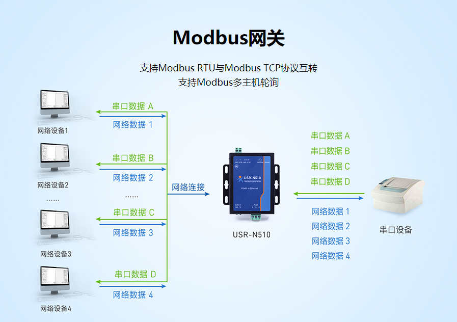 (3)若使用Modbus網(wǎng)關(guān)功能,設(shè)備直接將串口收到的modbus rtu協(xié)議數(shù)據(jù)解析成modbus tcp協(xié)議數(shù)據(jù)傳至網(wǎng)口輸出,例如串口終端設(shè)備向N510發(fā)送數(shù)據(jù)“010300000001840A”,通過N510傳輸至網(wǎng)口輸出的數(shù)據(jù)即為“000000000006010300000001”;反之網(wǎng)口轉(zhuǎn)串口亦然