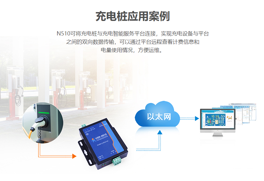 N510可將充電樁與充電智能服務(wù)平臺(tái)連接,實(shí)現(xiàn)充電設(shè)備與平臺(tái)之間的雙向數(shù)據(jù)傳輸,可以通過平臺(tái)遠(yuǎn)程查看計(jì)費(fèi)信息和電量使用情況,方便運(yùn)維