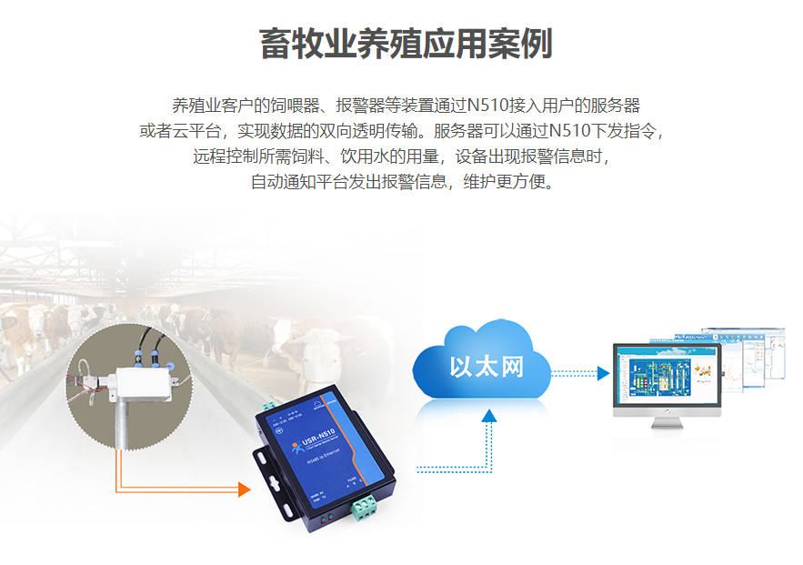 養(yǎng)殖業(yè)客戶的飼喂器、報(bào)警器等裝置通過N510接入用戶的服務(wù)器或者云平臺(tái),實(shí)現(xiàn)數(shù)據(jù)的雙向透明傳輸。服務(wù)器可以通過N510下發(fā)指令,遠(yuǎn)程控制所需飼料、飲用水的用量,設(shè)備出現(xiàn)報(bào)警信息時(shí),自動(dòng)通知平臺(tái)發(fā)出報(bào)警信息,維護(hù)更方便
