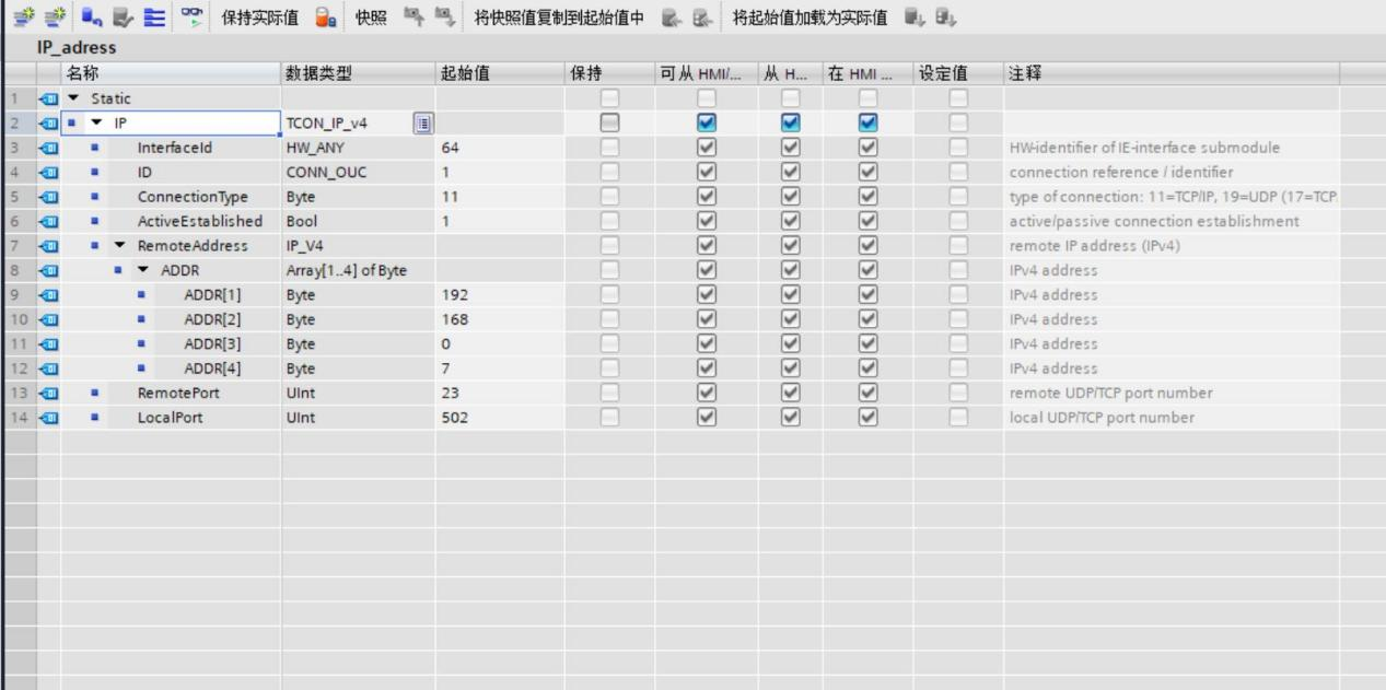 2)DB1參數(shù)數(shù)據(jù)塊中,設(shè)定服務(wù)器IP地址為192.168.0.7,端口號(hào)為23,本機(jī)端口為502。