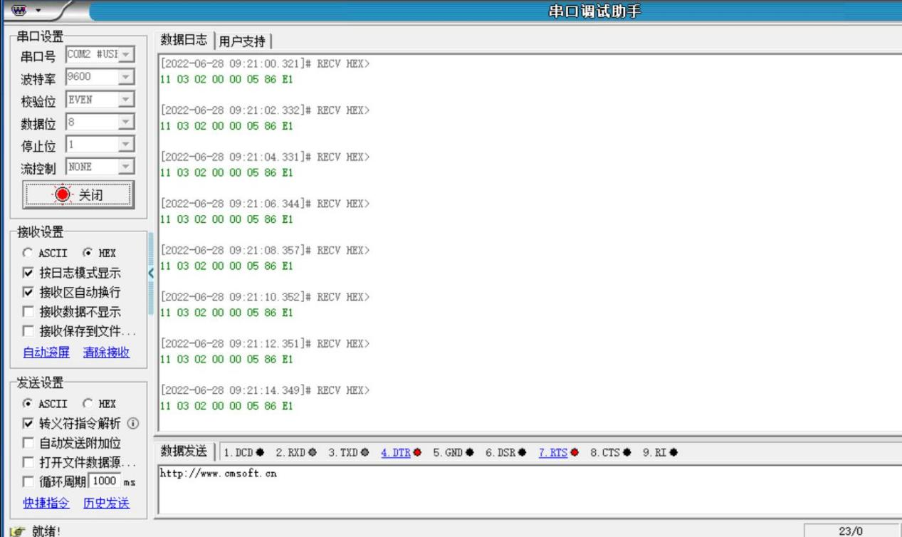 3,使用串口調(diào)試助手實(shí)時(shí)檢測(cè)N510轉(zhuǎn)換出來的數(shù)據(jù),如出現(xiàn)下列數(shù)據(jù)報(bào)文,代表檢測(cè)數(shù)據(jù)正常無誤