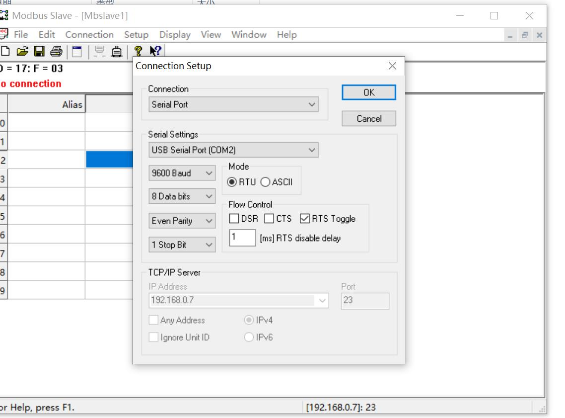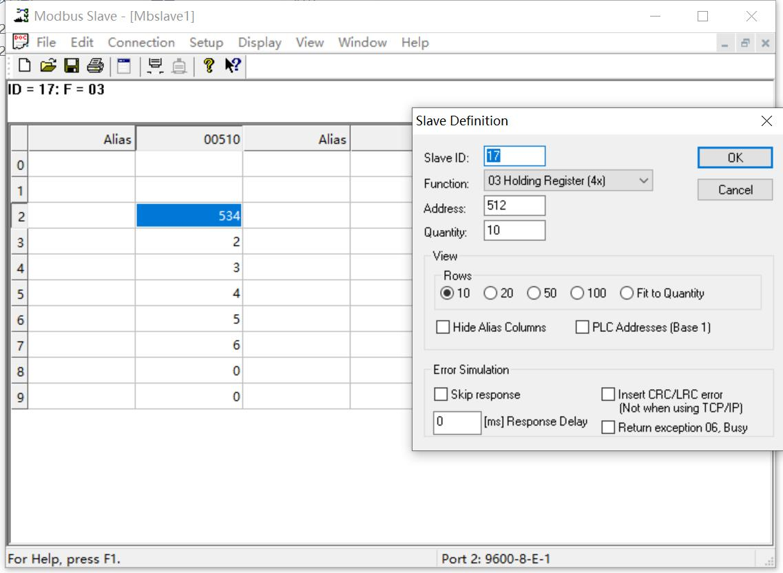 4,使用modbus slave 作為被采集從站,實(shí)時(shí)進(jìn)行數(shù)據(jù)檢測(cè),具體從站設(shè)定如下圖