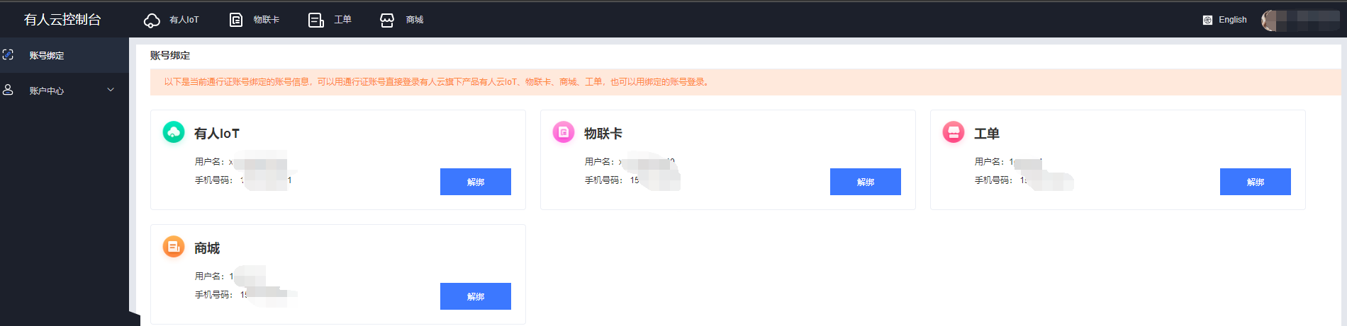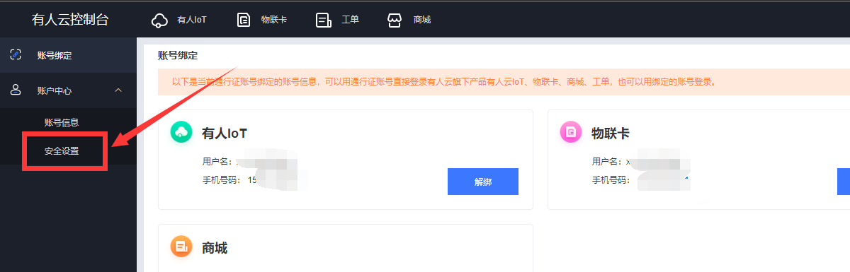 有人云賬號(hào)主要分為:有人iot賬號(hào)、物聯(lián)卡賬號(hào)、工單賬號(hào)、商城賬號(hào)與有人通行證賬號(hào),如果需要更換使用者,為了賬號(hào)的安全,建議全部賬號(hào)的綁定信息均進(jìn)行修改。
