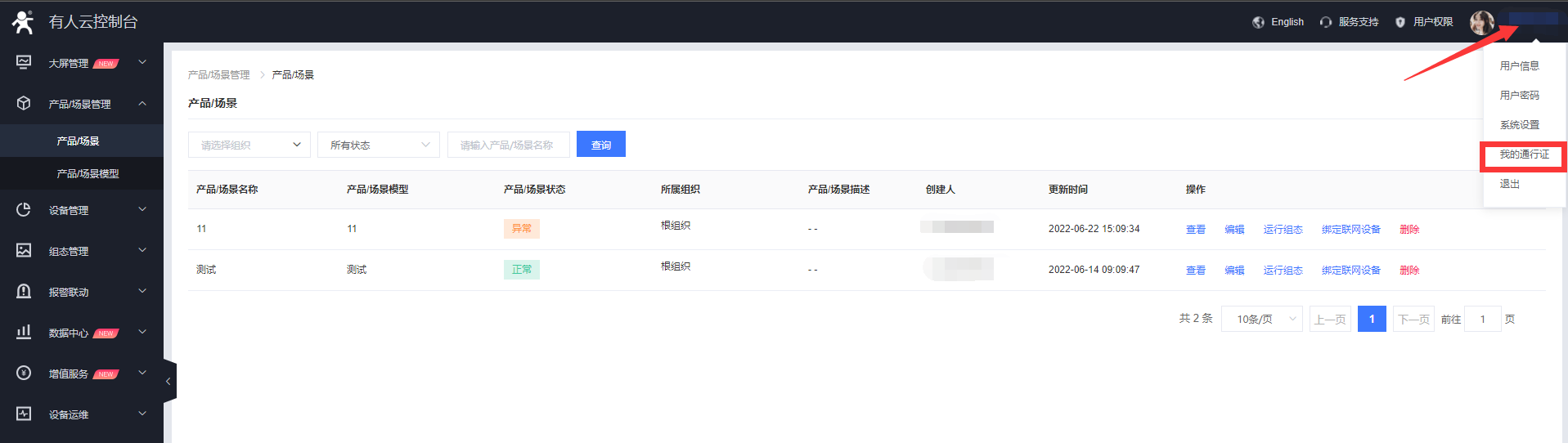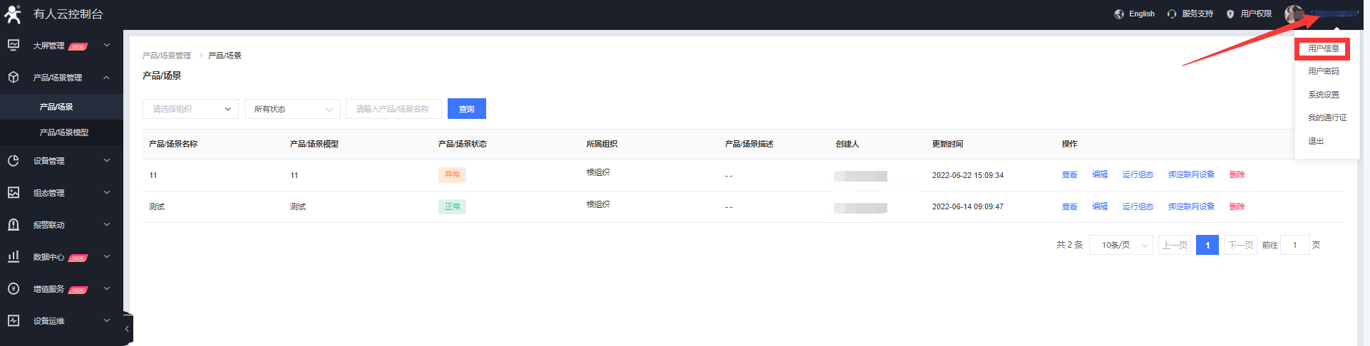 1、在有人iot界面點(diǎn)擊右上角用戶名,進(jìn)入用戶信息界面