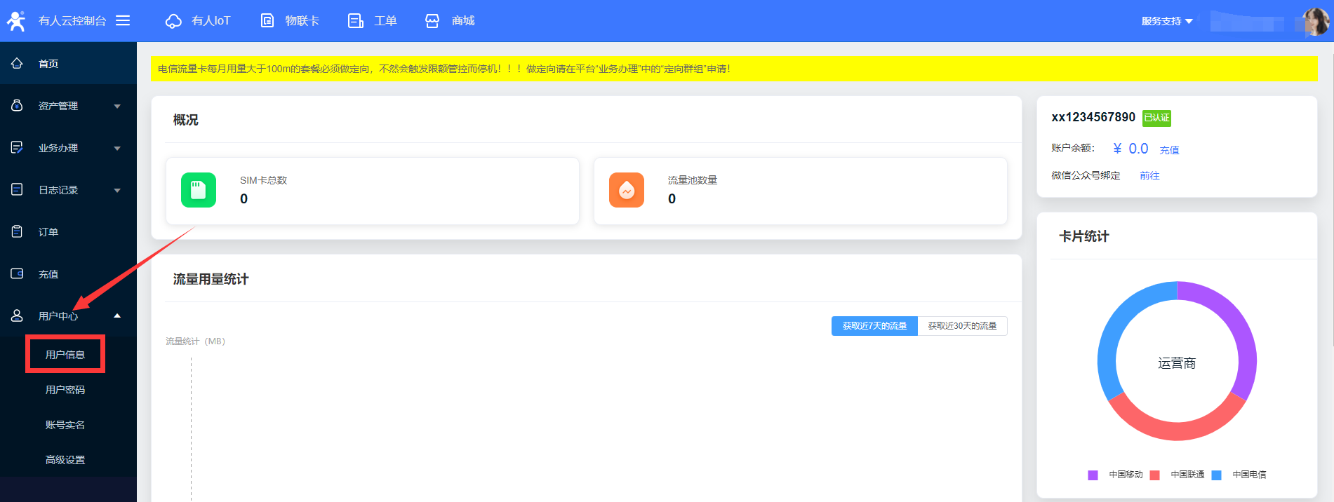 1、進(jìn)入物聯(lián)卡平臺(tái),在左側(cè) 用戶中心 菜單中進(jìn)入用戶信息界面
