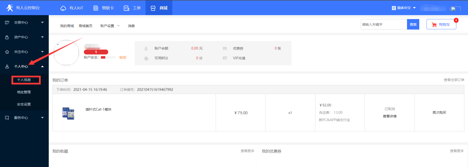 1、進(jìn)入商城平臺(tái),在左側(cè) 個(gè)人中心 菜單中進(jìn)入 個(gè)人信息 界面