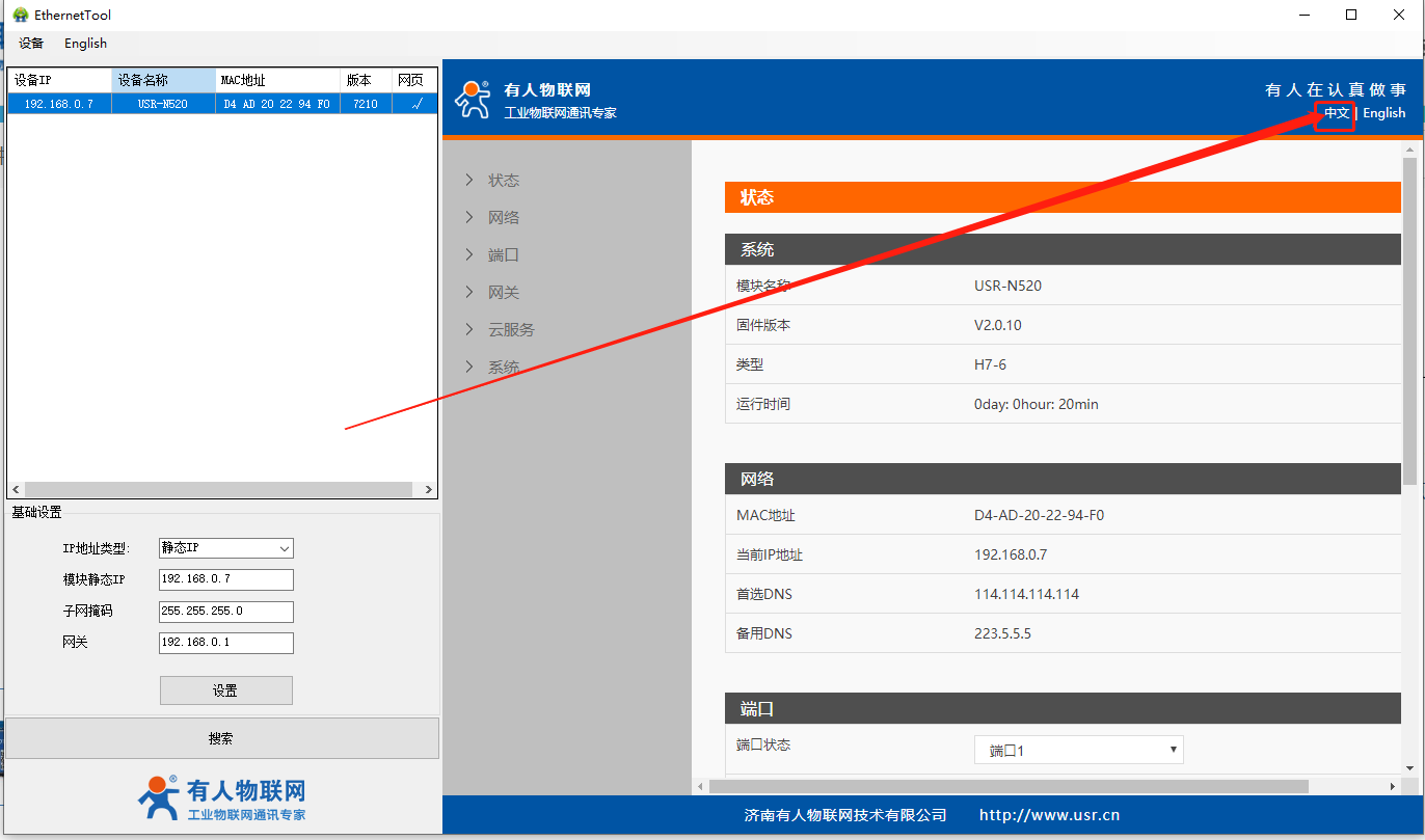 1)硬件連接:N520-H7的串口1通過USB轉(zhuǎn)232/485連接到電腦USB口,同時(shí)N520-H7的網(wǎng)口通過網(wǎng)線也連接到電腦網(wǎng)口上