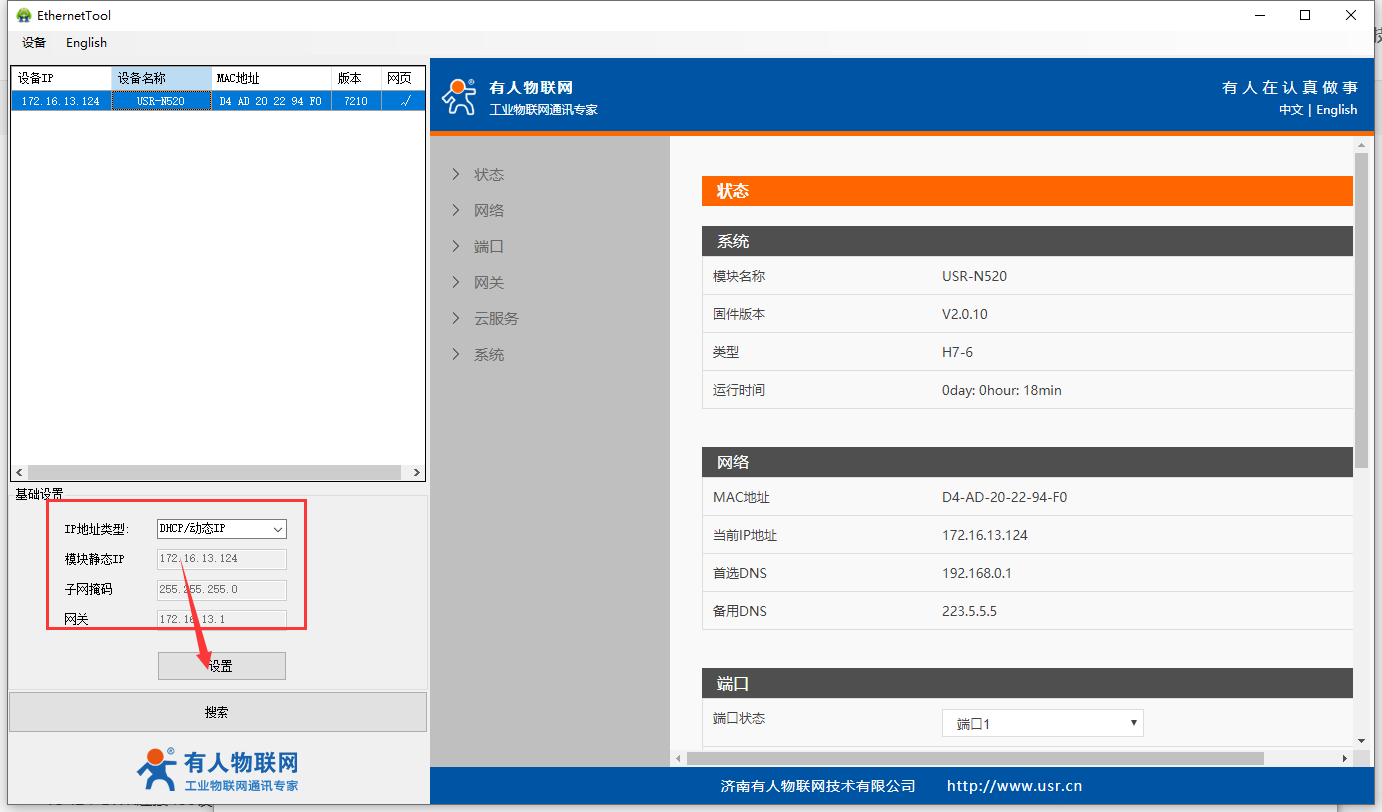 5)在設(shè)置軟件左下角基礎(chǔ)設(shè)置中,將N520設(shè)備IP地址類型改為DHCP/動(dòng)態(tài)IP(因?yàn)槲疫@里接的上級(jí)路由可以給下級(jí)動(dòng)態(tài)分配IP,所以這里選擇DHCP)。同時(shí)也可以修改為與上級(jí)網(wǎng)段一致的靜態(tài)IP,靜態(tài)IP地址與上級(jí)路由網(wǎng)段一致,子網(wǎng)掩碼和網(wǎng)關(guān)均與上級(jí)設(shè)置一致