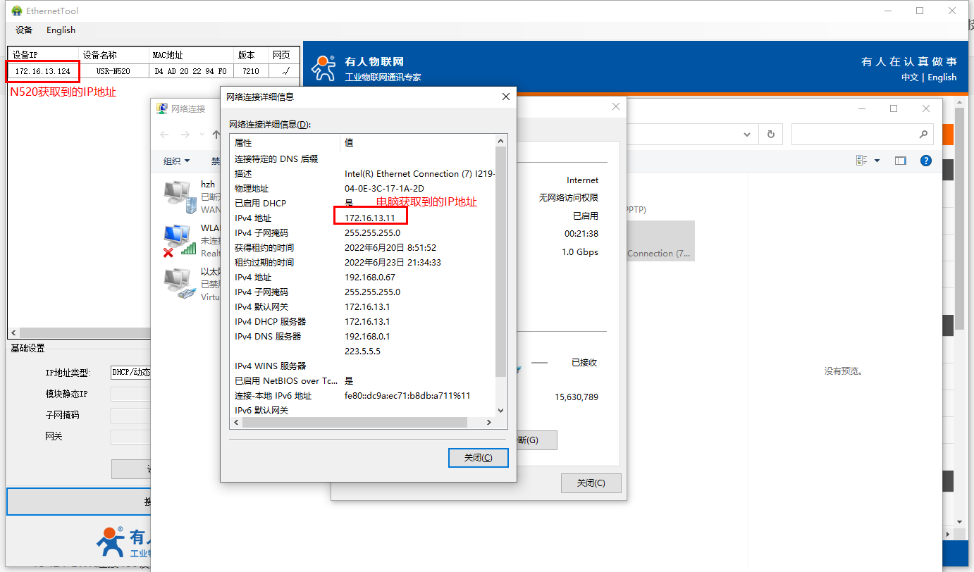 6)將N520設(shè)備接入上級(jí)路由的LAN口,電腦也連接同一個(gè)上級(jí)路由,同樣是DHCP獲取地址。之后再次通過軟件進(jìn)行搜索