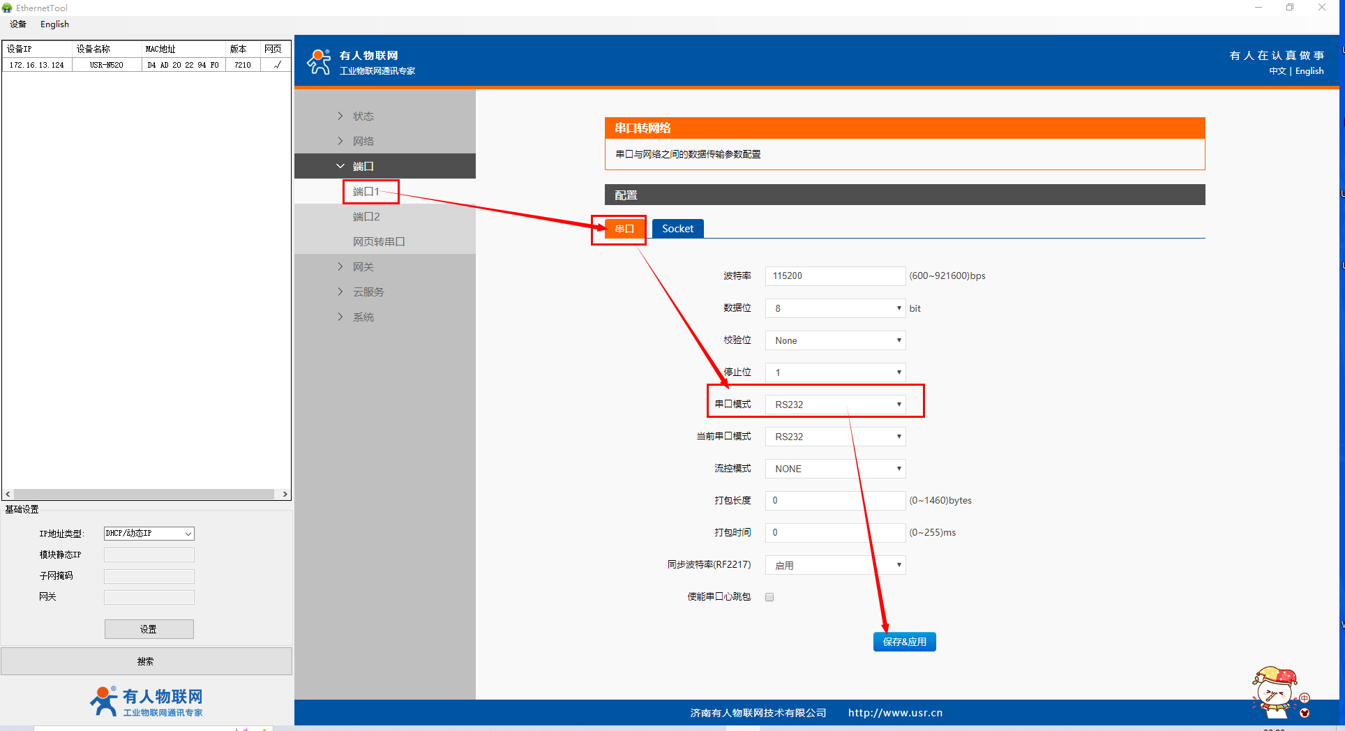 8)再次打開設(shè)置軟件,在端口處設(shè)置設(shè)備參數(shù),此處使用串口1的322串口進(jìn)行測(cè)試,所以需要選擇端口1(若使用串口2,則選擇端口2即可),串口模式選擇RS232(若使用485串口,串口模式選擇RS485即可),設(shè)置完此界面點(diǎn)擊下方保存并應(yīng)用,彈出提示后選擇繼續(xù)配置,所有參數(shù)都設(shè)置完之后再重啟就可以