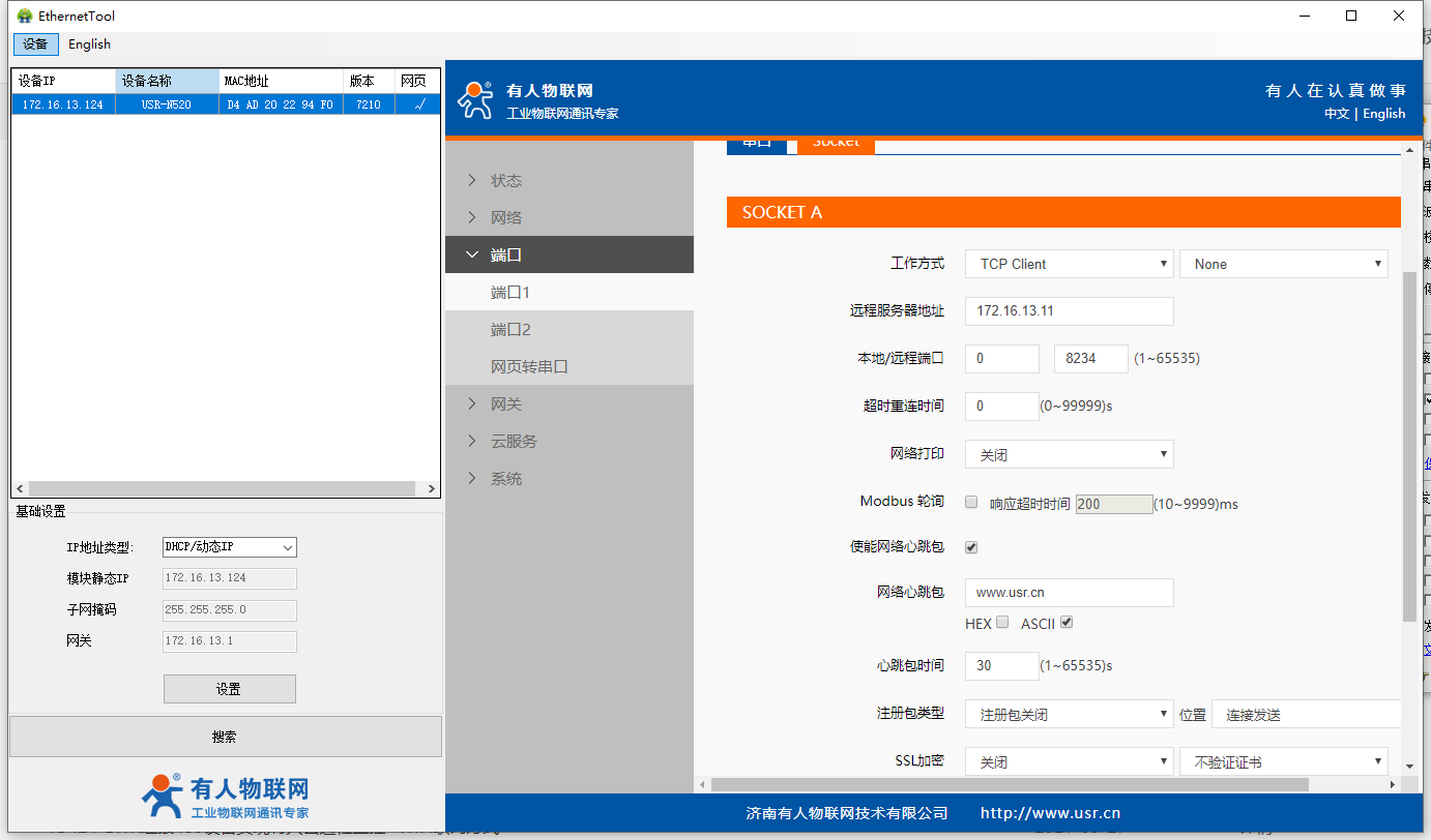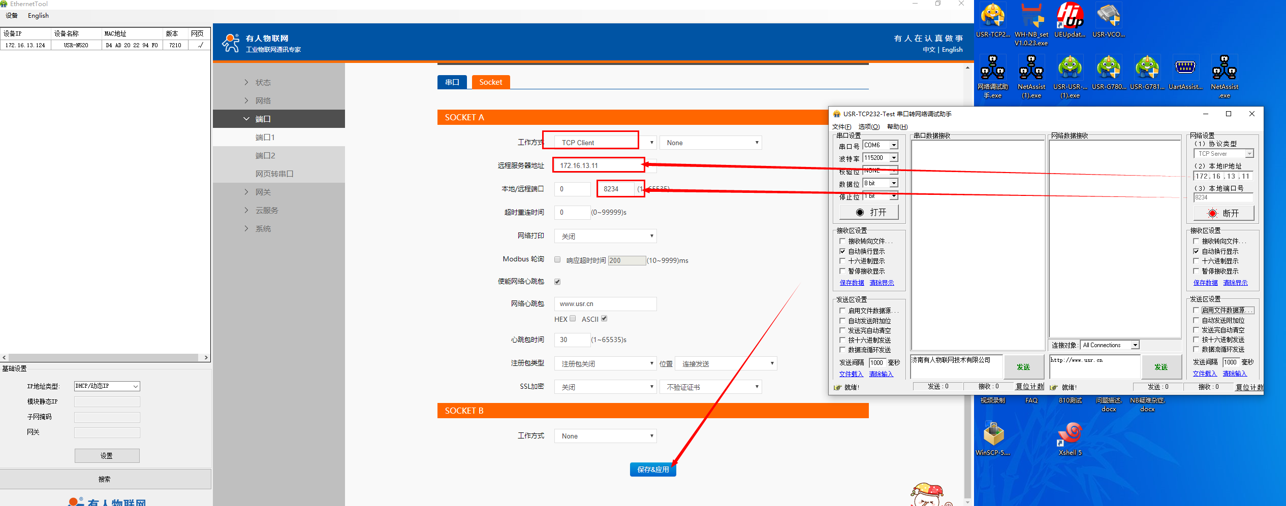 9)繼續(xù)在軟件中配置socket參數(shù),工作方式選擇tcp client,將服務(wù)器的IP以及端口填入到設(shè)備中,設(shè)置完成后點(diǎn)擊保存并應(yīng)用。全部參數(shù)設(shè)置完成后,點(diǎn)擊重啟。參數(shù)重啟后生效