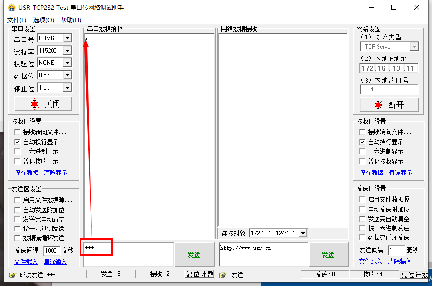 12)可以先判斷一下串口是否通了,可以在串口發(fā)送+++,如果設(shè)備收到+++后會(huì)自動(dòng)返回a,所以如果收到a就說明串口已經(jīng)通了