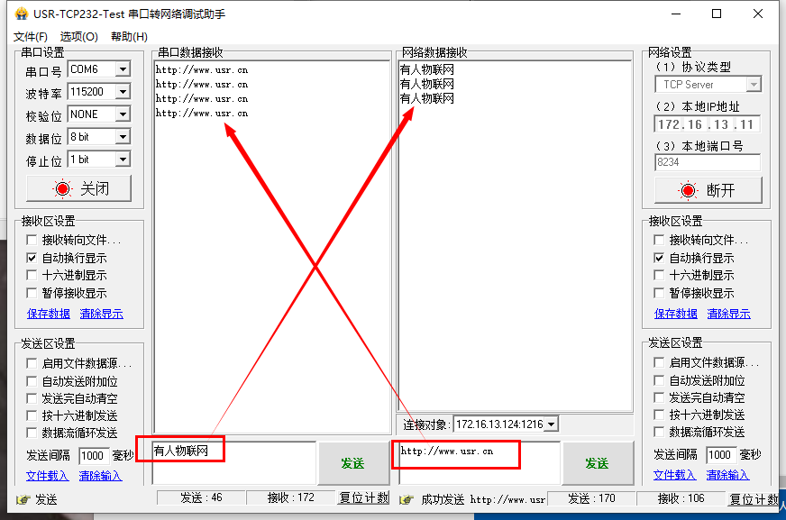 13)串口發(fā)送任意數(shù)據(jù),可以在網(wǎng)絡(luò)服務(wù)器接收,網(wǎng)絡(luò)服務(wù)器下發(fā)的任意數(shù)據(jù),也可以在串口接收。證明數(shù)據(jù)雙向透?jìng)鳑]有問題,至此測(cè)試結(jié)束