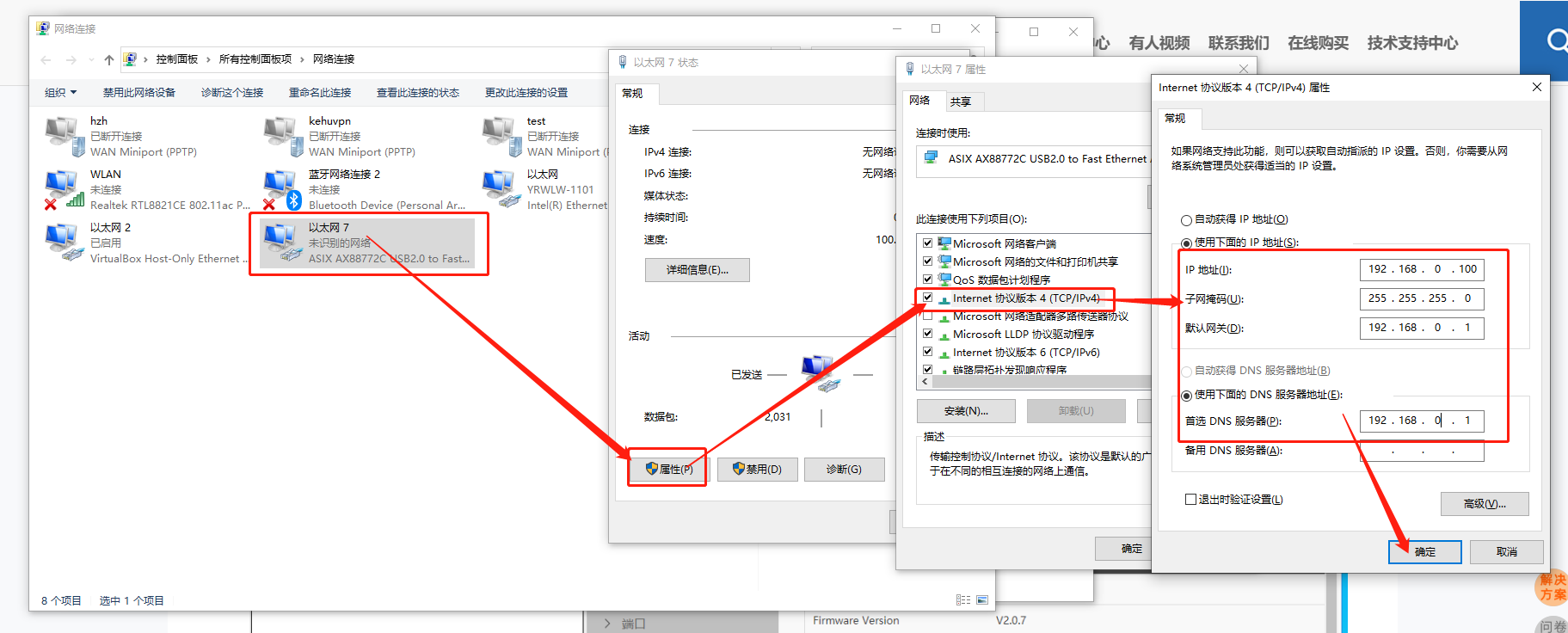 2)設(shè)備默認(rèn)IP為192.168.0.7,需要將電腦網(wǎng)卡改為與設(shè)備一致,可在電腦更改網(wǎng)絡(luò)適配器中更改